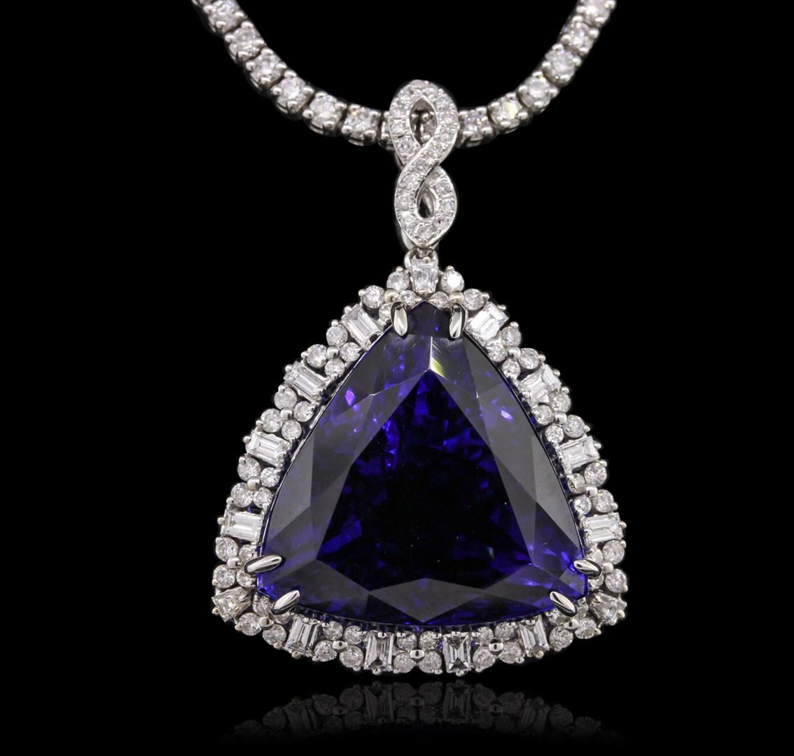 One electronically tested 14KT white gold ladies cast & assembled tanzanite and diamond pendant/enhancer with chain. The pendant/enhancer features a tanzanite set within a stylized diamond bezel, completed by a diamond set snap-locking bail. The pendant/enhancer is supported by an eighteen and one-half inch length flexible diamond ribbon, terminating in a concealed clasp with safety. Bright polish finish. Identified with markings of "585 14K". Condition is new, good workmanship. Containing: One prong set triangular modified brilliant cut natural tanzanite, measuring 21.60 x 21.95 x 14.97mm, exact weight 46.34ct., type I Clarity is eye clean, dark, moderately strong, violet-blue color, (GIA VB), cut is good. Transmitting light with no distortion, transparent. GIA Gemological Report attached. Graded loose prior to setting in the GIA Laboratory, Report #2161000229. Tanzanite is a very rare gemstone that is only found in the country of Tanzania. Originally discovered in 1967. Tiffany & Company, named the stone Tanzanite. It is found in the Usumburu Mountains that border the Umba Valley of northern Tanzania. Tanzanite occurs in gray, brown, violet, blue, reddish-purple, & green. The gem is interesting because of its exceptional pleochroism. Rotated in different directions a tanzanite will exhibit multiple changes of color. Tanzanite has a low tolerance to ultrasonic cleaning, and should not be cleaned using this method. Eighty-Six prong set round brilliant cut diamonds, measuring 2.20 - 2.10 x 1.29mm (depth est.) approximate total weight of 86 Stones = 3.15ct. Graded in the setting. Clarity: SI-1 to SI-2. Color: H - J Seventy-Eight prong set round brilliant cut diamonds, measuring 1.60 - 1.10 x 0.81mm (depth est.) approximate total weight of 78 Stones = 0.70ct. Graded in the setting, Graded in the setting. Clarity: SI-2 to I-2. Color: G - I Fifteen prong set baguette cut diamonds, measuring from 2.70 x 1.60 x 1.12mm (depth est.) to 2.80 x 1.70 x 1.19mm (depth est.) approximate total weight of 15 Stones = 0.71ct. Graded in the setting. Clarity: VS-1 to VS-2. Color: G - I. Total Weight of Colored Stones 46.34ct. Total Weight of Diamonds 4.56ct. Total Weight of Pendant/Enhancer With Chain 39.22 grams. AIG Appraised at $136,455.00.
