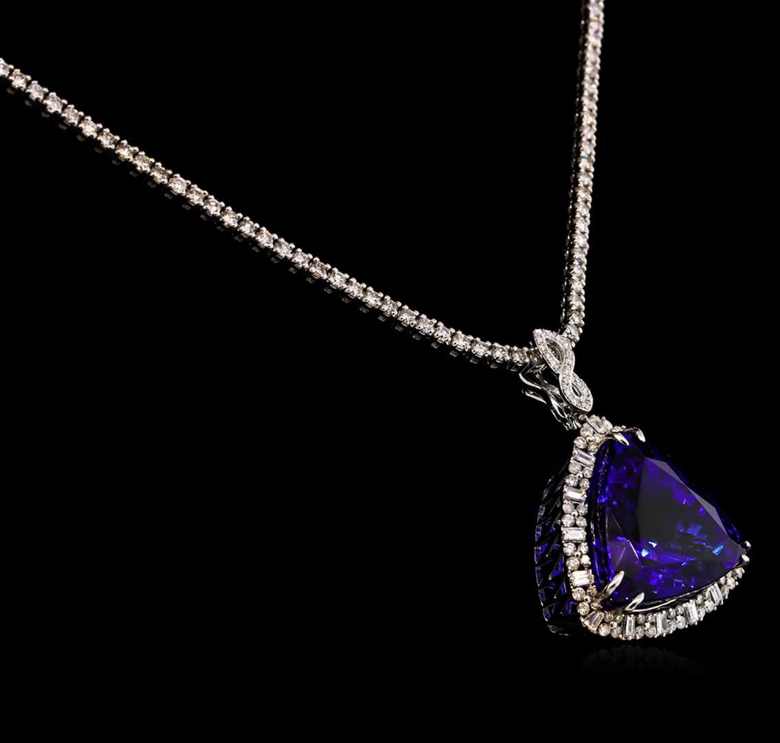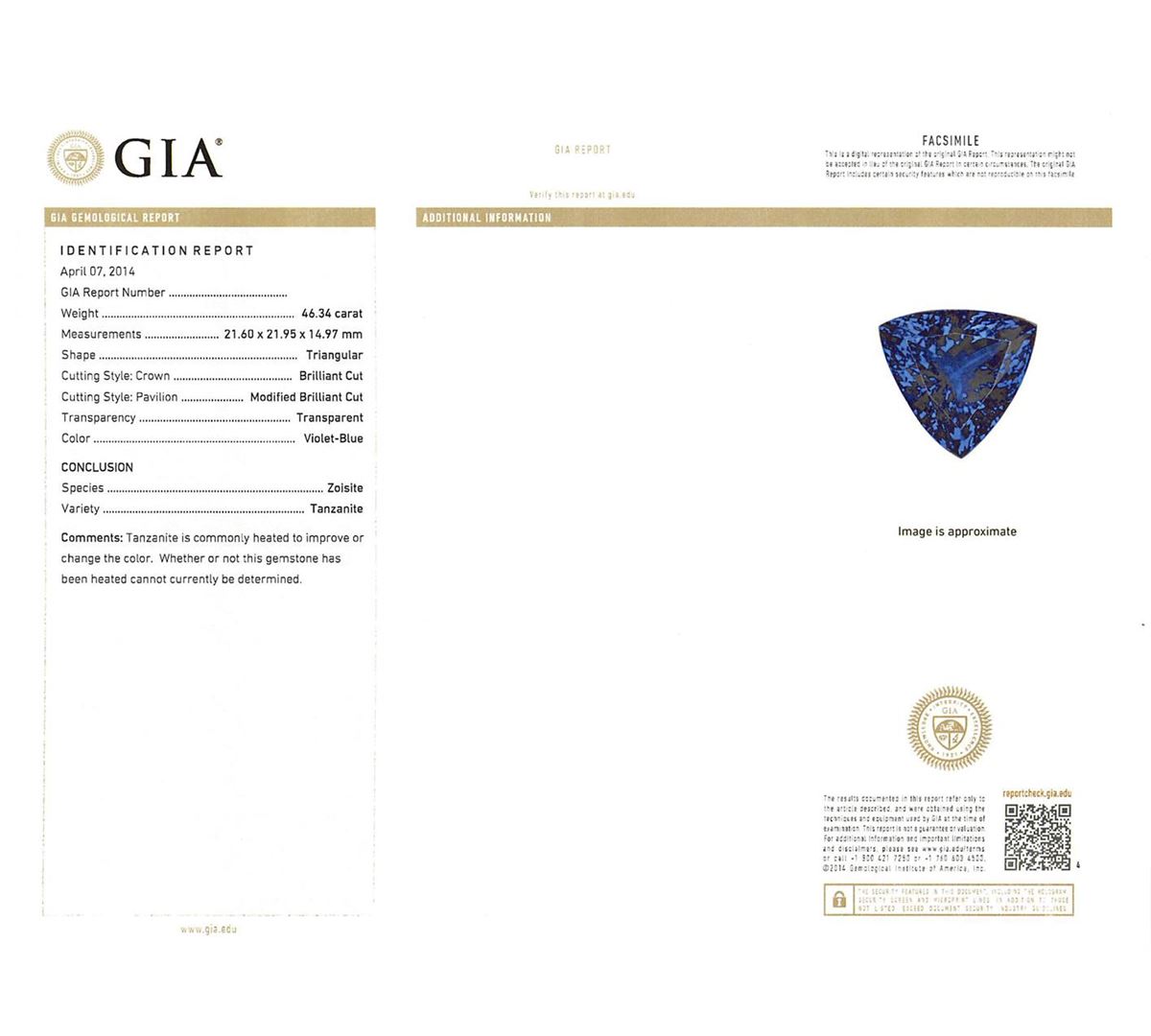 One electronically tested 14KT white gold ladies cast & assembled tanzanite and diamond pendant/enhancer with chain. The pendant/enhancer features a tanzanite set within a stylized diamond bezel, completed by a diamond set snap-locking bail. The pendant/enhancer is supported by an eighteen and one-half inch length flexible diamond ribbon, terminating in a concealed clasp with safety. Bright polish finish. Identified with markings of "585 14K". Condition is new, good workmanship. Containing: One prong set triangular modified brilliant cut natural tanzanite, measuring 21.60 x 21.95 x 14.97mm, exact weight 46.34ct., type I Clarity is eye clean, dark, moderately strong, violet-blue color, (GIA VB), cut is good. Transmitting light with no distortion, transparent. GIA Gemological Report attached. Graded loose prior to setting in the GIA Laboratory, Report #2161000229. Tanzanite is a very rare gemstone that is only found in the country of Tanzania. Originally discovered in 1967. Tiffany & Company, named the stone Tanzanite. It is found in the Usumburu Mountains that border the Umba Valley of northern Tanzania. Tanzanite occurs in gray, brown, violet, blue, reddish-purple, & green. The gem is interesting because of its exceptional pleochroism. Rotated in different directions a tanzanite will exhibit multiple changes of color. Tanzanite has a low tolerance to ultrasonic cleaning, and should not be cleaned using this method. Eighty-Six prong set round brilliant cut diamonds, measuring 2.20 - 2.10 x 1.29mm (depth est.) approximate total weight of 86 Stones = 3.15ct. Graded in the setting. Clarity: SI-1 to SI-2. Color: H - J Seventy-Eight prong set round brilliant cut diamonds, measuring 1.60 - 1.10 x 0.81mm (depth est.) approximate total weight of 78 Stones = 0.70ct. Graded in the setting, Graded in the setting. Clarity: SI-2 to I-2. Color: G - I Fifteen prong set baguette cut diamonds, measuring from 2.70 x 1.60 x 1.12mm (depth est.) to 2.80 x 1.70 x 1.19mm (depth est.) approximate total weight of 15 Stones = 0.71ct. Graded in the setting. Clarity: VS-1 to VS-2. Color: G - I. Total Weight of Colored Stones 46.34ct. Total Weight of Diamonds 4.56ct. Total Weight of Pendant/Enhancer With Chain 39.22 grams. AIG Appraised at $136,455.00.