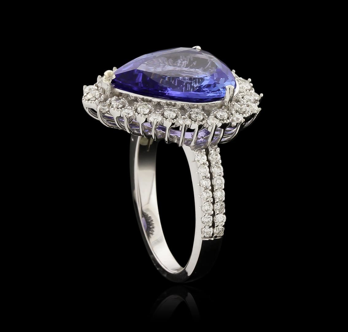 One electronically tested 14KT white gold ladies cast tanzanite & diamond ring with a bright finish. The featured tanzanite is set within a diamond bezel, supported by diamond set shoulders, completed by a two millimeter wide band. Identified with markings of "14K". Condition is new, good workmanship. Containing: One prong set pear brilliant cut natural tanzanite, measuring 14.38 x 10.31 x 5.23mm, exact weight 5.07ct., clarity is eye clean, type I, medium dark, moderately strong, violet color, (GIA V 6/4), cut is good. Transmitting light with no distortion, transparent. Graded loose prior to setting in the GIA Laboratory, Report #2171051902. The report is attached. Tanzanite is a very rare gemstone that is only found in the country of Tanzania. Originally discovered in 1967. Tiffany & Company, named the stone Tanzanite. It is found in the Usumburu Mountains that border the Umba Valley of northern Tanzania. Tanzanite occurs in gray, brown, violet, blue, reddish-purple, & green. The gem is interesting because of its exceptional pleochroism. Rotated in different directions a tanzanite will exhibit multiple changes of color. Tanzanite has a low tolerance to ultrasonic cleaning, and should not be cleaned using this method. Sixty prong set round brilliant cut diamonds, measuring 1.40 - 1.30 x 0.81mm (depth est.) approximate total weight of 60 Stones = 0.54ct. Graded in the setting. Clarity: SI-1 to SI-2. Color: G - H. Total Weight of Colored Stones 5.07ct. Total Weight of Diamonds 0.54ct. Total Weight of Ring 6.18 grams. AIG Appraised at $14,750.00.