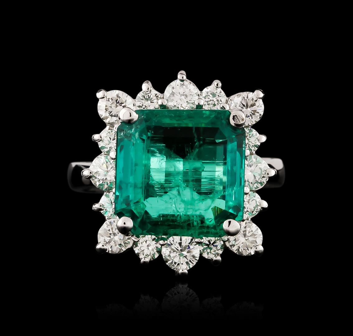 One electronically tested 14KT white gold ladies cast emerald and diamond ring with a bright polish finish. Identified with markings of "14K". Condition is new. Containing: One prong set emerald standard step cut natural emerald, measuring 11.47 x 11.34 x 6.25mm, exact weight 6.41ct., clarity is moderately included, type III, medium, moderately strong, green color, (GIA G 5/4), cut is good. Graded loose prior to setting by GIA Gemological Laboratory. GIA Report: 1166901498.Eight prong set round brilliant cut diamonds, measuring 3.00 - 3.00 x 1.80mm (depth est.) approximate total weight of 8 Stones = 0.79ct. Clarity: SI-1 to SI-2. Color: H - I, Cut is Good. Eight prong set round brilliant cut diamonds, measuring 2.50 - 2.50 x 1.50mm (depth est.) approximate total weight of 8 Stones = 0.46ct. Clarity: VS-2 to SI-1. Color: H - J, Cut is Good. Colored gemstones are presumed to have been subjected to commonly used enhancement processes. All diamonds and colored gemstones are graded in the mounting, unless otherwise stated. Total Weight of Colored Stones 6.41ct. Total Weight of Diamonds 1.25ct. Total Weight of Ring 6.70 grams. GGL Appraised at $23,660.00.