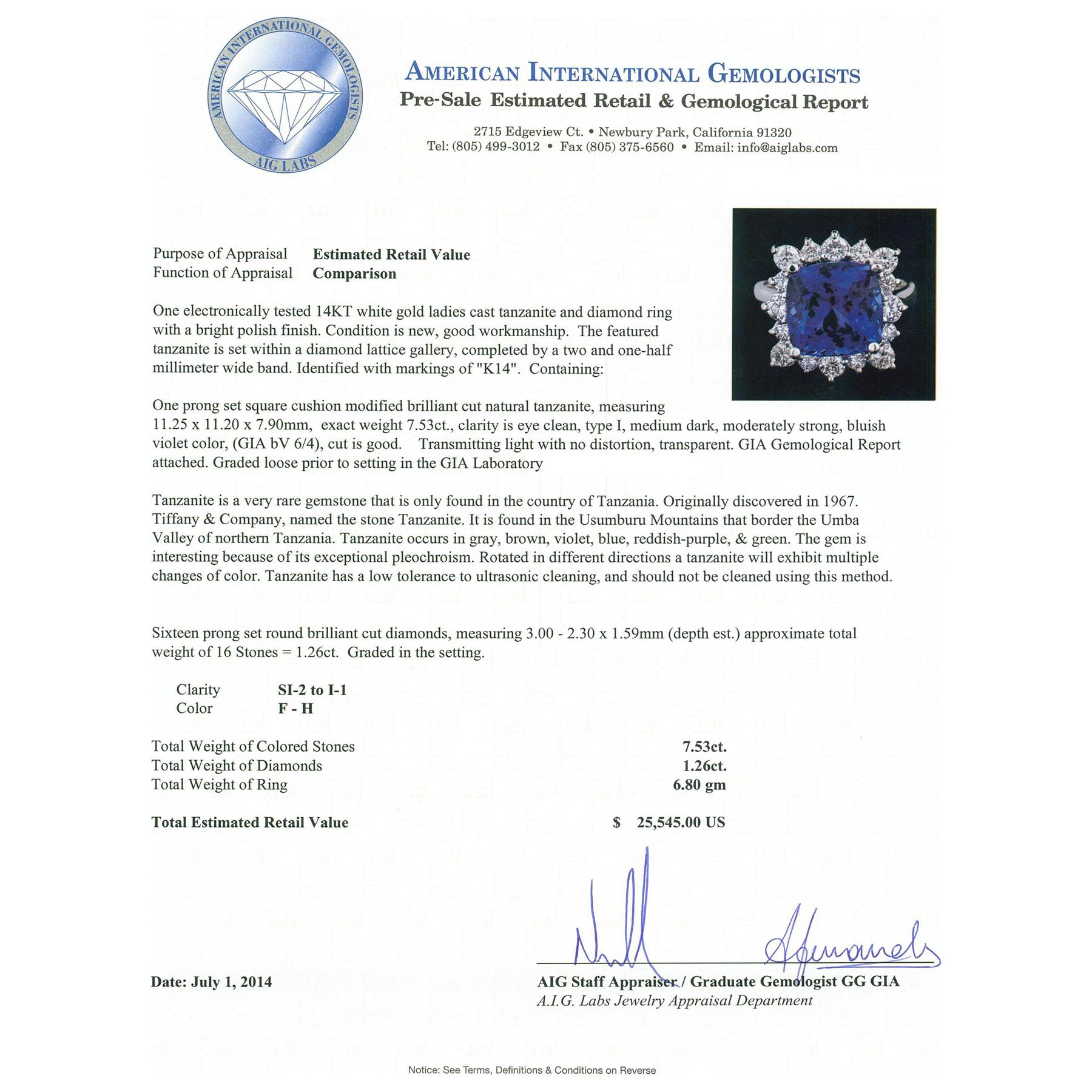 One electronically tested 14KT white gold ladies cast tanzanite and diamond ring with a bright polish finish. Condition is new, good workmanship. The featured tanzanite is set within a diamond lattice gallery, completed by a two and one-half millimeter wide band. Identified with markings of "K14". Containing: One prong set square cushion modified brilliant cut natural tanzanite, measuring 11.25 x 11.20 x 7.90mm, exact weight 7.53ct., clarity is eye clean, type I, medium dark, moderately strong, bluish violet color, (GIA bV 6/4), cut is good. Transmitting light with no distortion, transparent. GIA Gemological Report attached. Graded loose prior to setting in the GIA Laboratory, Report # 6167097858.Tanzanite is a very rare gemstone that is only found in the country of Tanzania. Originally discovered in 1967. Tiffany & Company, named the stone Tanzanite. It is found in the Usumburu Mountains that border the Umba Valley of northern Tanzania. Tanzanite occurs in gray, brown, violet, blue, reddish-purple, & green. The gem is interesting because of its exceptional pleochroism. Rotated in different directions a tanzanite will exhibit multiple changes of color. Tanzanite has a low tolerance to ultrasonic cleaning, and should not be cleaned using this method. Sixteen prong set round brilliant cut diamonds, measuring 3.00 - 2.30 x 1.59mm (depth est.) approximate total weight of 16 Stones = 1.26ct. Graded in the setting. Clarity: SI-2 to I-1 . Color: F - H. Total Weight of Colored Stones 7.53ct. Total Weight of Diamonds 1.26ct. Total Weight of Ring 6.80 grams. AIG Appraised at $25,545.00.