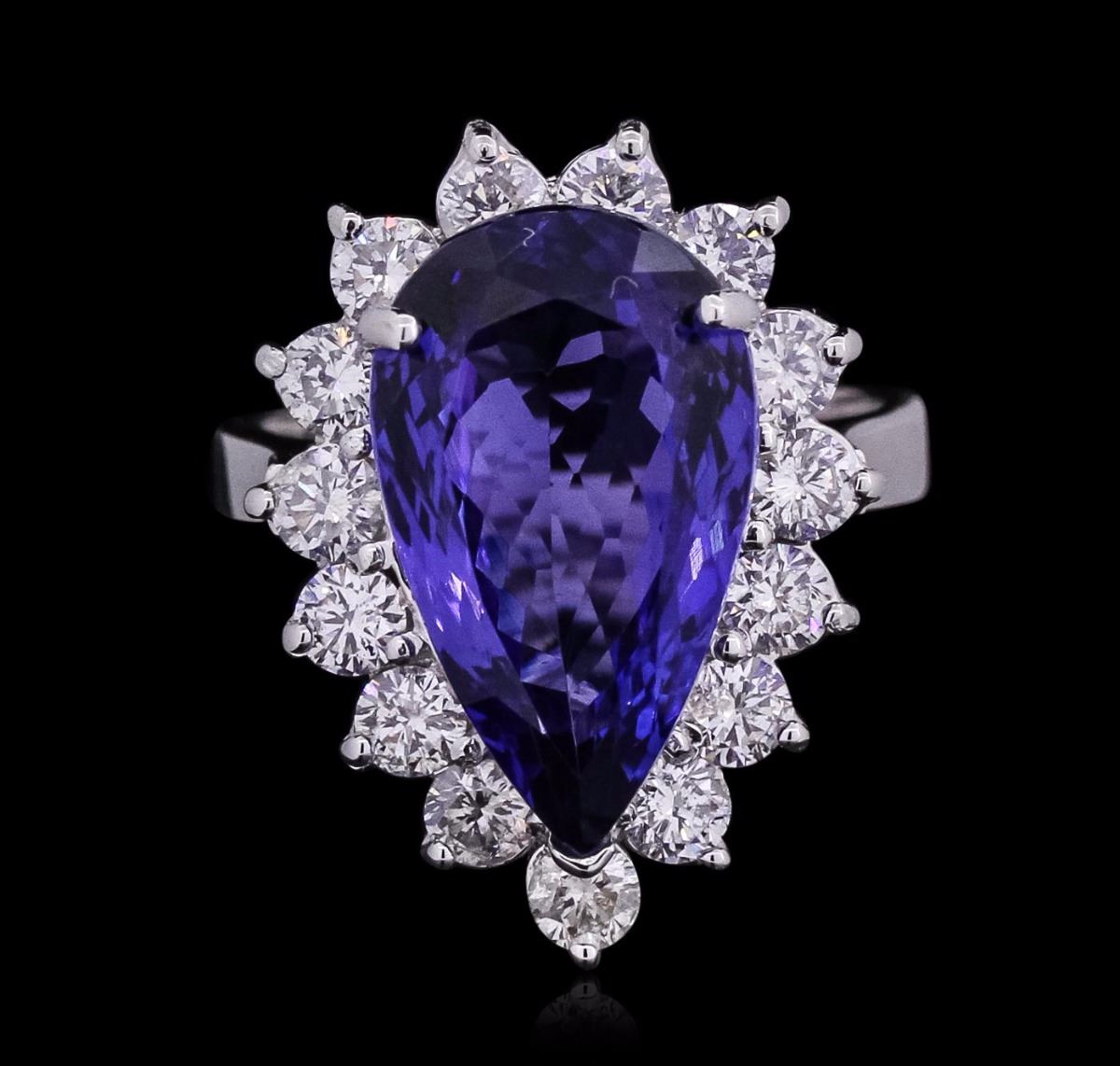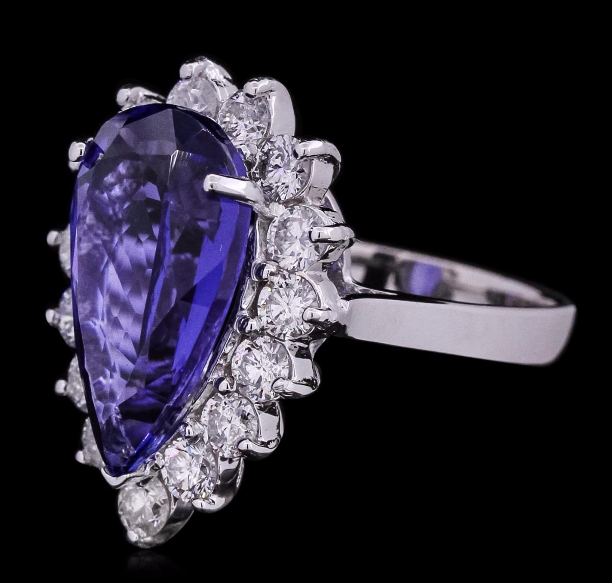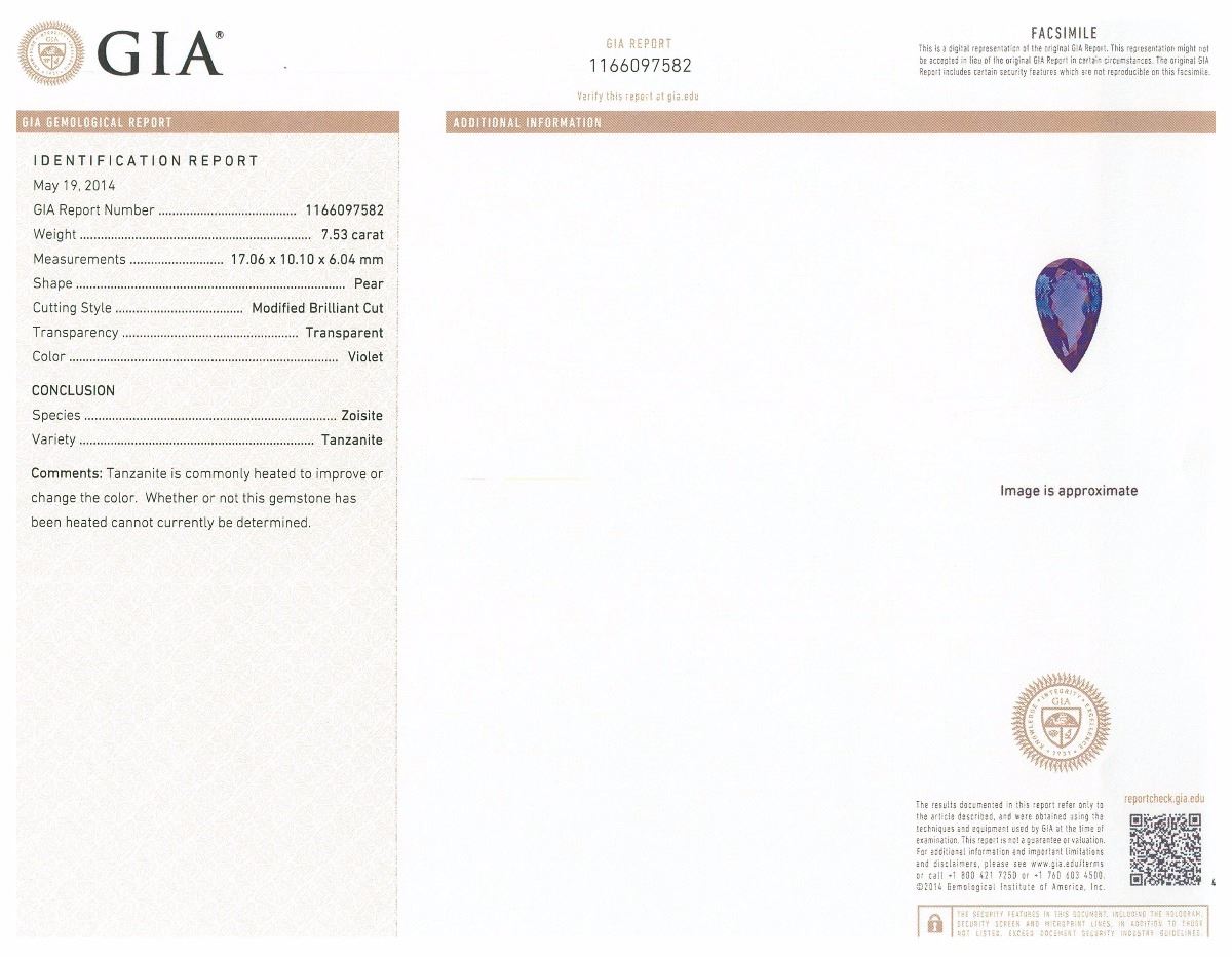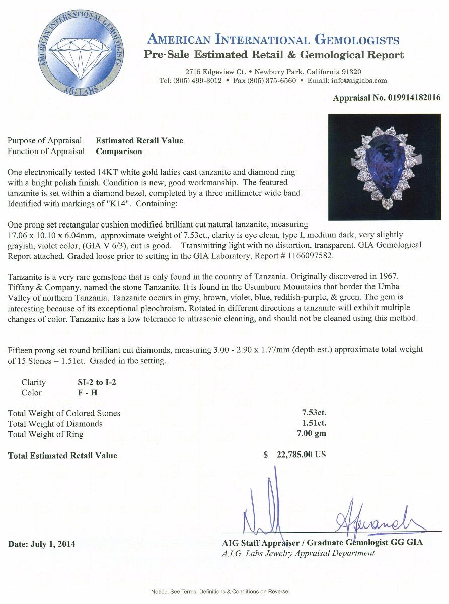 One electronically tested 14KT white gold ladies cast tanzanite and diamond ring with a bright polish finish. Condition is new, good workmanship. The featured tanzanite is set within a diamond bezel, completed by a three millimeter wide band. Identified with markings of "K14". Containing: One prong set rectangular cushion modified brilliant cut natural tanzanite, measuring 17.06 x 10.10 x 6.04mm, approximate weight of 7.53ct., clarity is eye clean, type I, medium dark, very slightly grayish, violet color, (GIA V 6/3), cut is good. Transmitting light with no distortion, transparent. GIA Gemological Report attached. Graded loose prior to setting in the GIA Laboratory, Report # 1166097582.Tanzanite is a very rare gemstone that is only found in the country of Tanzania. Originally discovered in 1967. Tiffany & Company, named the stone Tanzanite. It is found in the Usumburu Mountains that border the Umba Valley of northern Tanzania. Tanzanite occurs in gray, brown, violet, blue, reddish-purple, & green. The gem is interesting because of its exceptional pleochroism. Rotated in different directions a tanzanite will exhibit multiple changes of color. Tanzanite has a low tolerance to ultrasonic cleaning, and should not be cleaned using this method. Fifteen prong set round brilliant cut diamonds, measuring 3.00 - 2.90 x 1.77mm (depth est.) approximate total weight of 15 Stones = 1.51ct. Graded in the setting. Clarity: SI-2 to I-2. Color: F - H. Total Weight of Colored Stones 7.53ct. Total Weight of Diamonds 1.51ct. Total Weight of Ring 7.00 grams. AIG Appraised at $22,785.00.