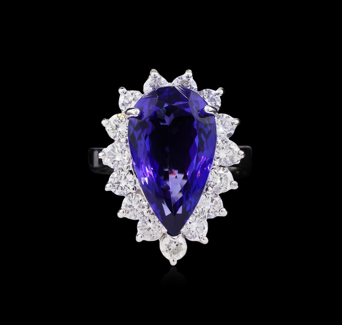 One electronically tested 14KT white gold ladies cast tanzanite and diamond ring with a bright polish finish. Condition is new, good workmanship. The featured tanzanite is set within a diamond bezel, completed by a three millimeter wide band. Identified with markings of "K14". Containing: One prong set rectangular cushion modified brilliant cut natural tanzanite, measuring 17.06 x 10.10 x 6.04mm, approximate weight of 7.53ct., clarity is eye clean, type I, medium dark, very slightly grayish, violet color, (GIA V 6/3), cut is good. Transmitting light with no distortion, transparent. GIA Gemological Report attached. Graded loose prior to setting in the GIA Laboratory, Report # 1166097582.Tanzanite is a very rare gemstone that is only found in the country of Tanzania. Originally discovered in 1967. Tiffany & Company, named the stone Tanzanite. It is found in the Usumburu Mountains that border the Umba Valley of northern Tanzania. Tanzanite occurs in gray, brown, violet, blue, reddish-purple, & green. The gem is interesting because of its exceptional pleochroism. Rotated in different directions a tanzanite will exhibit multiple changes of color. Tanzanite has a low tolerance to ultrasonic cleaning, and should not be cleaned using this method. Fifteen prong set round brilliant cut diamonds, measuring 3.00 - 2.90 x 1.77mm (depth est.) approximate total weight of 15 Stones = 1.51ct. Graded in the setting. Clarity: SI-2 to I-2. Color: F - H. Total Weight of Colored Stones 7.53ct. Total Weight of Diamonds 1.51ct. Total Weight of Ring 7.00 grams. AIG Appraised at $22,785.00.