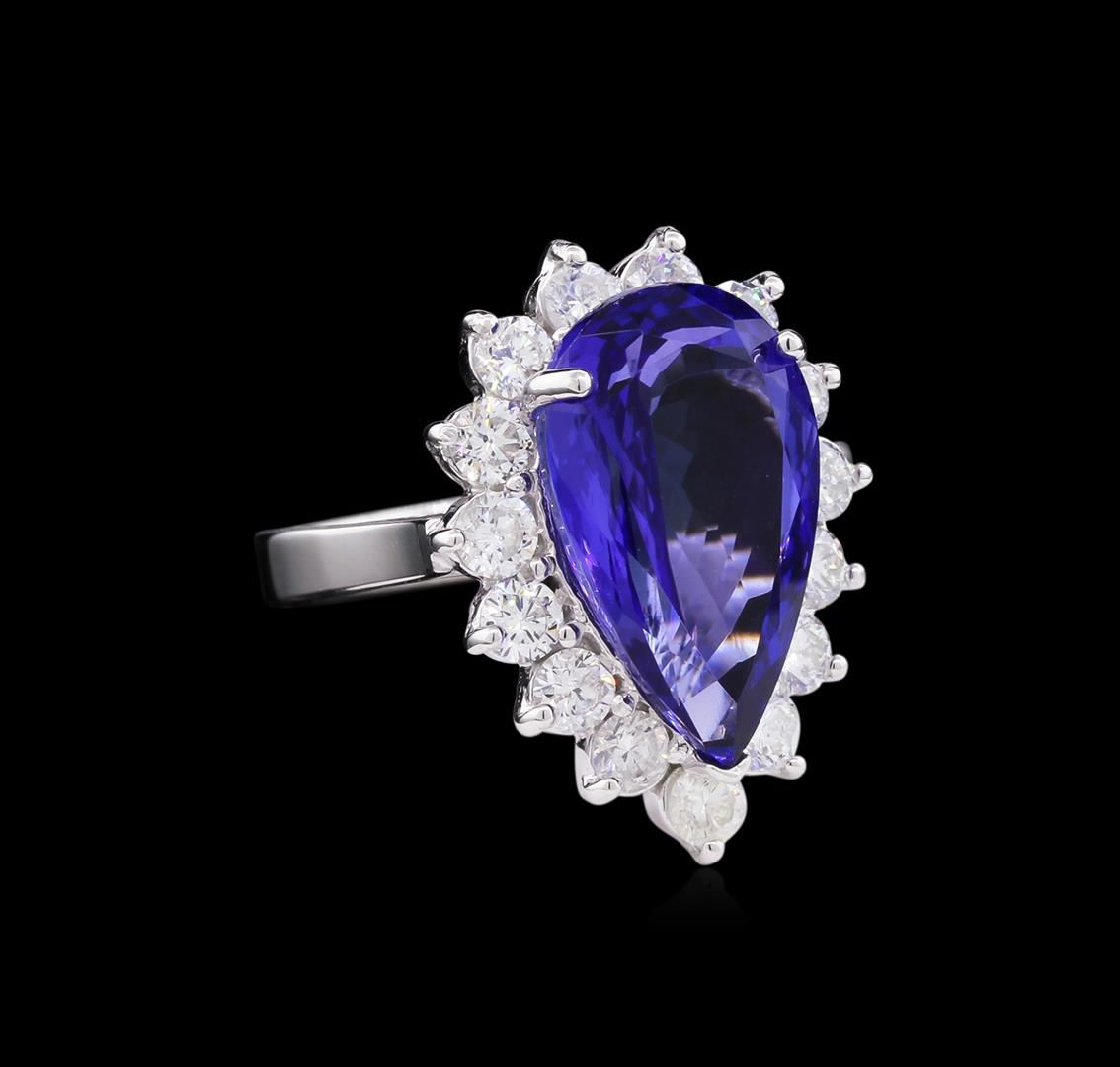 One electronically tested 14KT white gold ladies cast tanzanite and diamond ring with a bright polish finish. Condition is new, good workmanship. The featured tanzanite is set within a diamond bezel, completed by a three millimeter wide band. Identified with markings of "K14". Containing: One prong set rectangular cushion modified brilliant cut natural tanzanite, measuring 17.06 x 10.10 x 6.04mm, approximate weight of 7.53ct., clarity is eye clean, type I, medium dark, very slightly grayish, violet color, (GIA V 6/3), cut is good. Transmitting light with no distortion, transparent. GIA Gemological Report attached. Graded loose prior to setting in the GIA Laboratory, Report # 1166097582.Tanzanite is a very rare gemstone that is only found in the country of Tanzania. Originally discovered in 1967. Tiffany & Company, named the stone Tanzanite. It is found in the Usumburu Mountains that border the Umba Valley of northern Tanzania. Tanzanite occurs in gray, brown, violet, blue, reddish-purple, & green. The gem is interesting because of its exceptional pleochroism. Rotated in different directions a tanzanite will exhibit multiple changes of color. Tanzanite has a low tolerance to ultrasonic cleaning, and should not be cleaned using this method. Fifteen prong set round brilliant cut diamonds, measuring 3.00 - 2.90 x 1.77mm (depth est.) approximate total weight of 15 Stones = 1.51ct. Graded in the setting. Clarity: SI-2 to I-2. Color: F - H. Total Weight of Colored Stones 7.53ct. Total Weight of Diamonds 1.51ct. Total Weight of Ring 7.00 grams. AIG Appraised at $22,785.00.