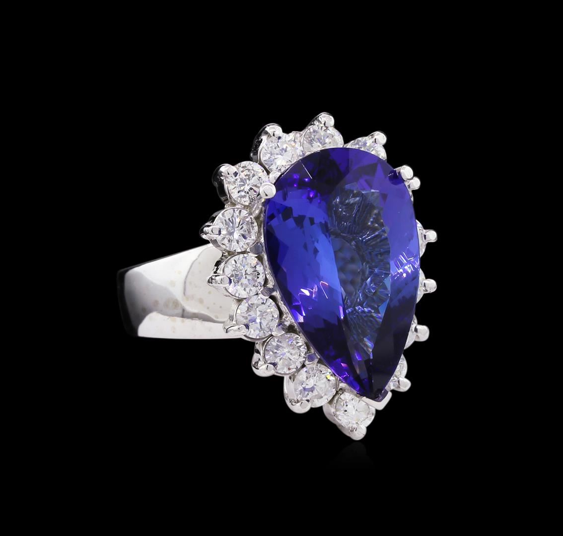 One electronically tested 14KT white gold ladies cast tanzanite and diamond ring with a bright polish finish. Condition is new, good workmanship. The featured tanzanite is set within a diamond bezel, completed by a four millimeter wide band. Identified with markings of "K14". Containing: One prong set pear modified brilliant cut natural tanzanite, measuring 18.05 x 11.67 x 6.18mm, exact weight 8.26ct., clarity is eye clean, type I, medium dark, moderately strong, bluish violet color, (GIA bV 6/4), cut is good. Transmitting light with no distortion, transparent. GIA Gemological Report attached. Graded loose prior to setting in the GIA Laboratory, Report #2161097612.Tanzanite is a very rare gemstone that is only found in the country of Tanzania. Originally discovered in 1967. Tiffany & Company, named the stone Tanzanite. It is found in the Usumburu Mountains that border the Umba Valley of northern Tanzania. Tanzanite occurs in gray, brown, violet, blue, reddish-purple, & green. The gem is interesting because of its exceptional pleochroism. Rotated in different directions a tanzanite will exhibit multiple changes of color. Tanzanite has a low tolerance to ultrasonic cleaning, and should not be cleaned using this method. Fifteen prong set round brilliant cut diamonds, measuring 3.30 - 3.10 x 1.92mm (depth est.) approximate total weight of 15 Stones = 1.90ct. Graded in the setting. Clarity: SI-1 to I-1. Color: G - I. Total Weight of Colored Stones 8.26ct. Total Weight of Diamonds 1.90ct. Total Weight of Ring 12.42 grams. AIG Appraised at $28,445.00.