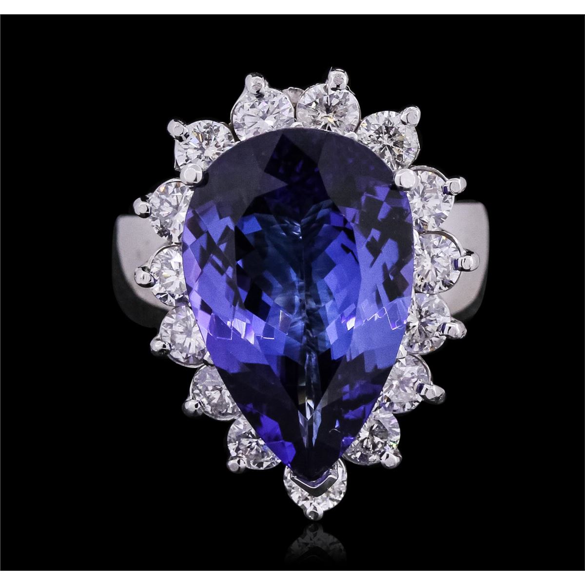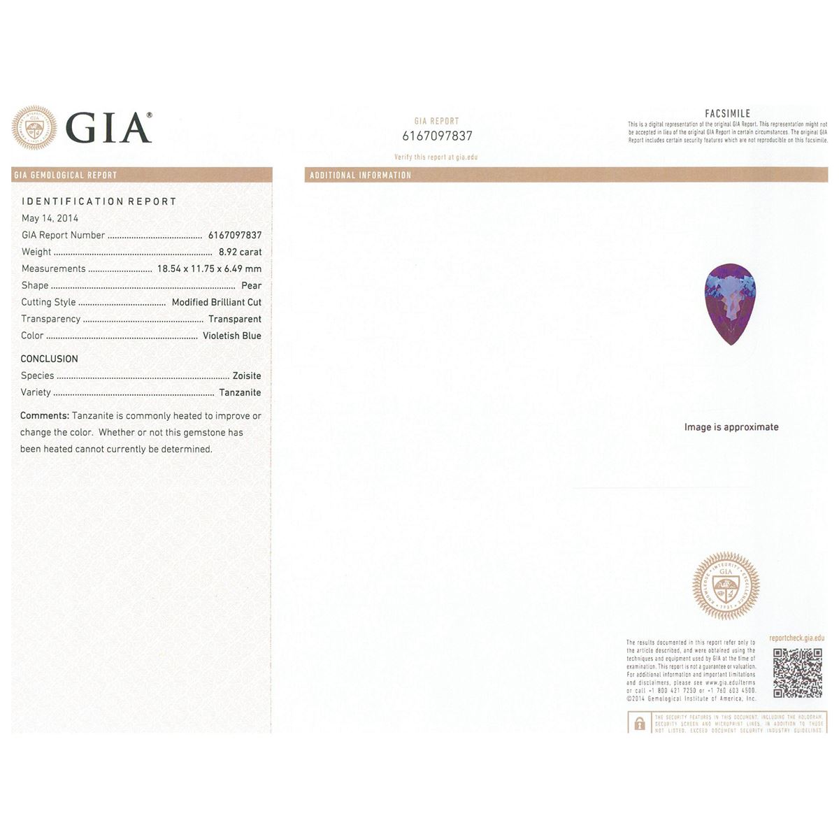 One electronically tested 14KT white gold ladies cast tanzanite and diamond ring with a bright polish finish. Condition is new, good workmanship. The featured tanzanite is set within a diamond bezel, completed by a four millimeter wide band. Identified with markings of "K14". Containing: One prong set pear modified brilliant cut natural tanzanite, measuring 18.05 x 11.67 x 6.18mm, exact weight 8.26ct., clarity is eye clean, type I, medium dark, moderately strong, bluish violet color, (GIA bV 6/4), cut is good. Transmitting light with no distortion, transparent. GIA Gemological Report attached. Graded loose prior to setting in the GIA Laboratory, Report #2161097612.Tanzanite is a very rare gemstone that is only found in the country of Tanzania. Originally discovered in 1967. Tiffany & Company, named the stone Tanzanite. It is found in the Usumburu Mountains that border the Umba Valley of northern Tanzania. Tanzanite occurs in gray, brown, violet, blue, reddish-purple, & green. The gem is interesting because of its exceptional pleochroism. Rotated in different directions a tanzanite will exhibit multiple changes of color. Tanzanite has a low tolerance to ultrasonic cleaning, and should not be cleaned using this method. Fifteen prong set round brilliant cut diamonds, measuring 3.30 - 3.10 x 1.92mm (depth est.) approximate total weight of 15 Stones = 1.90ct. Graded in the setting. Clarity: SI-1 to I-1. Color: G - I. Total Weight of Colored Stones 8.26ct. Total Weight of Diamonds 1.90ct. Total Weight of Ring 12.42 grams. AIG Appraised at $28,445.00.