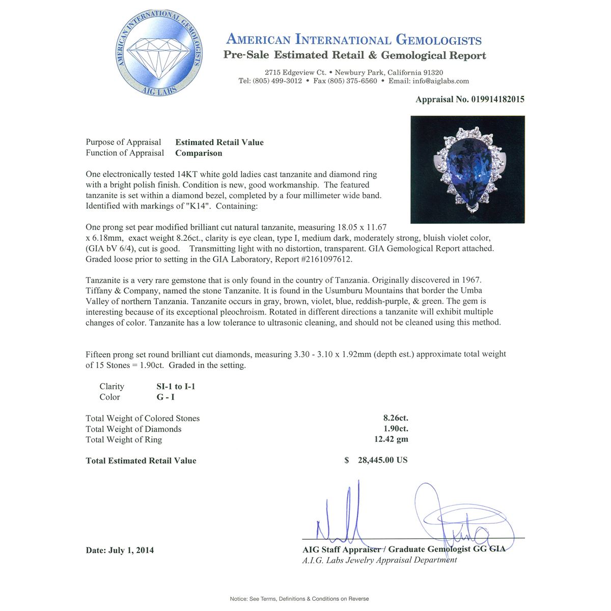 One electronically tested 14KT white gold ladies cast tanzanite and diamond ring with a bright polish finish. Condition is new, good workmanship. The featured tanzanite is set within a diamond bezel, completed by a four millimeter wide band. Identified with markings of "K14". Containing: One prong set pear modified brilliant cut natural tanzanite, measuring 18.05 x 11.67 x 6.18mm, exact weight 8.26ct., clarity is eye clean, type I, medium dark, moderately strong, bluish violet color, (GIA bV 6/4), cut is good. Transmitting light with no distortion, transparent. GIA Gemological Report attached. Graded loose prior to setting in the GIA Laboratory, Report #2161097612.Tanzanite is a very rare gemstone that is only found in the country of Tanzania. Originally discovered in 1967. Tiffany & Company, named the stone Tanzanite. It is found in the Usumburu Mountains that border the Umba Valley of northern Tanzania. Tanzanite occurs in gray, brown, violet, blue, reddish-purple, & green. The gem is interesting because of its exceptional pleochroism. Rotated in different directions a tanzanite will exhibit multiple changes of color. Tanzanite has a low tolerance to ultrasonic cleaning, and should not be cleaned using this method. Fifteen prong set round brilliant cut diamonds, measuring 3.30 - 3.10 x 1.92mm (depth est.) approximate total weight of 15 Stones = 1.90ct. Graded in the setting. Clarity: SI-1 to I-1. Color: G - I. Total Weight of Colored Stones 8.26ct. Total Weight of Diamonds 1.90ct. Total Weight of Ring 12.42 grams. AIG Appraised at $28,445.00.