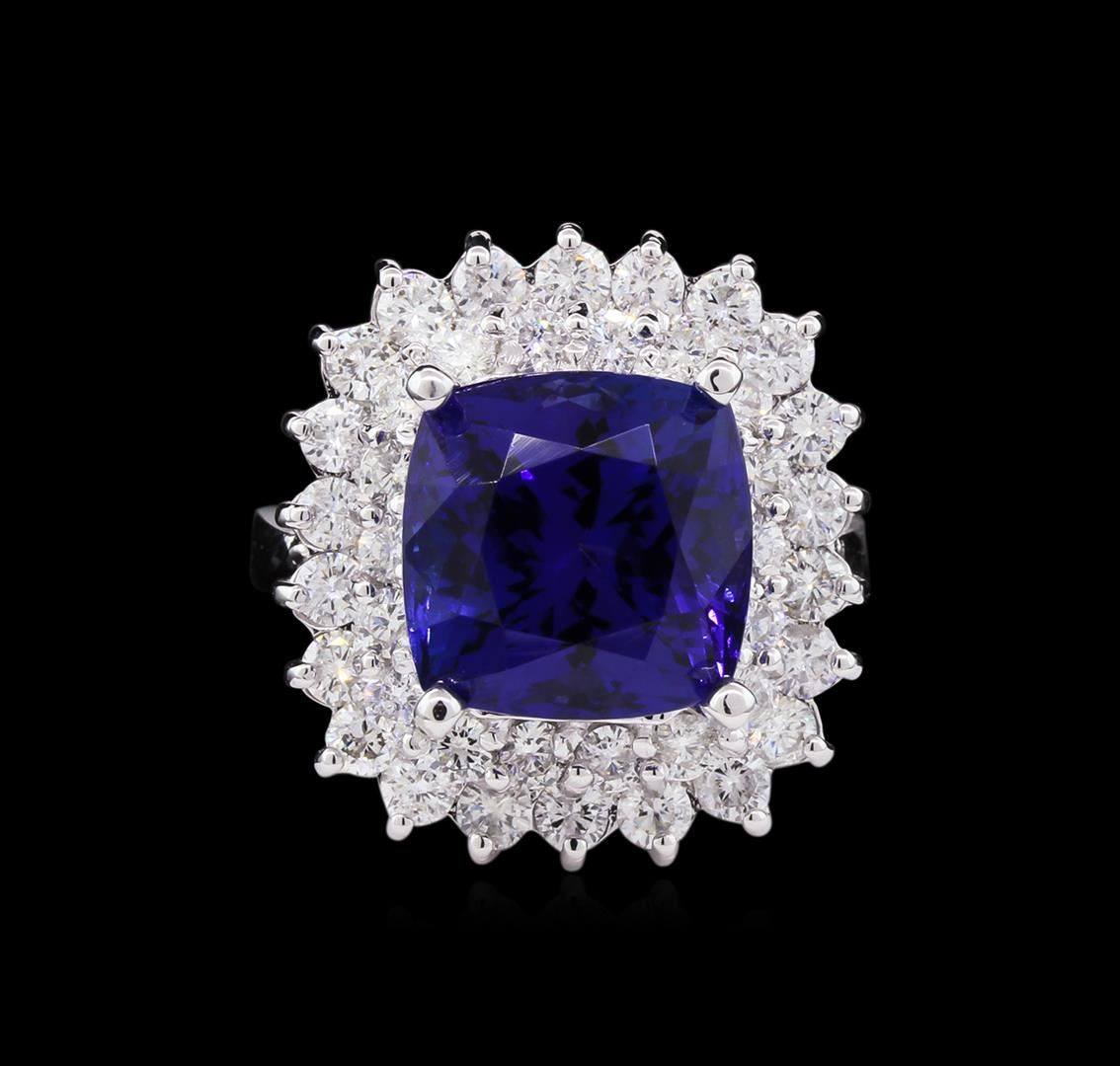 One electronically tested 14KT white gold ladies cast tanzanite and diamond ring with a bright polish finish. Condition is new, good workmanship. The featured tanzanite is set within a diamond lattice gallery, completed by a two and one-half millimeter wide band. Identified with markings of "K14". Containing: One prong set square cushion modified brilliant cut natural tanzanite, measuring 11.25 x 11.20 x 8.72mm, exact weight 8.39ct., clarity is eye clean, type I, medium dark, moderately strong, violet color, (GIA V 6/4), cut is good. Transmitting light with no distortion, transparent. GIA Gemological Report attached. Graded loose prior to setting in the GIA Laboratory, Report # 1166097601.Tanzanite is a very rare gemstone that is only found in the country of Tanzania. Originally discovered in 1967. Tiffany & Company, named the stone Tanzanite. It is found in the Usumburu Mountains that border the Umba Valley of northern Tanzania. Tanzanite occurs in gray, brown, violet, blue, reddish-purple, & green. The gem is interesting because of its exceptional pleochroism. Rotated in different directions a tanzanite will exhibit multiple changes of color. Tanzanite has a low tolerance to ultrasonic cleaning, and should not be cleaned using this method. Forty prong set round brilliant cut diamonds, measuring 2.50 - 2.10 x 1.38mm (depth est.) approximate total weight of 40 Stones = 2.03ct. Graded in the setting. Clarity: SI-2 to I-2. Color: F - H. Total Weight of Colored Stones 8.39ct. Total Weight of Diamonds 2.03ct. Total Weight of Ring 12.90 grams. AIG Appraised at $30,600.00.