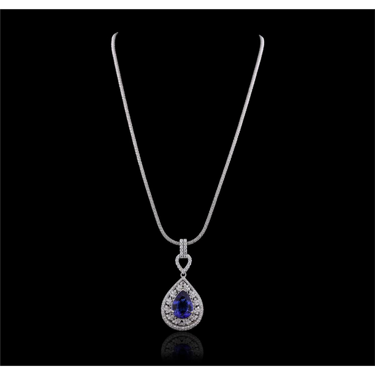 One electronically tested 14KT white gold ladies cast & assembled tanzanite and diamond pendant with chain. Condition is new, good workmanship. The pendant features a tanzanite set within a stylized diamond set lattice gallery, completed by a diamond set bail. The pendant is supported by an eighteen inch length 14KT white gold designer style chain, terminating in a lobster claw clasp. Bright polish finish. Trademark is Orianne. Identified with markings of "14K". Containing: One prong set pear modified brilliant cut natural tanzanite, measuring 16.60 x 11.77 x 6.35mm, exact weight 8.63ct., clarity is eye clean, type I, dark, moderately strong, violetish blue color, (GIA vB 7/4), cut is good. Transmitting light with no distortion, transparent. GIA Gemological Report attached. Graded loose prior to setting in the GIA Laboratory, Report #6157964566.Tanzanite is a very rare gemstone that is only found in the country of Tanzania. Originally discovered in 1967. Tiffany & Company, named the stone Tanzanite. It is found in the Usumburu Mountains that border the Umba Valley of northern Tanzania. Tanzanite occurs in gray, brown, violet, blue, reddish-purple, & green. The gem is interesting because of its exceptional pleochroism. Rotated in different directions a tanzanite will exhibit multiple changes of color. Tanzanite has a low tolerance to ultrasonic cleaning, and should not be cleaned using this method. One Hundred Seventy-Five prong set round brilliant cut diamonds, measuring 1.90 - 1.20 x 0.93mm (depth est.) approximate total weight of 175 Stones = 2.32ct. Graded in the setting. Clarity: SI-2 to I-2. Color: G - I. Total Weight of Colored Stones 8.63ct. Total Weight of Diamonds 2.32ct. Total Weight of Pendant With Chain 22.87 grams. AIG Appraised at $31,805.00.