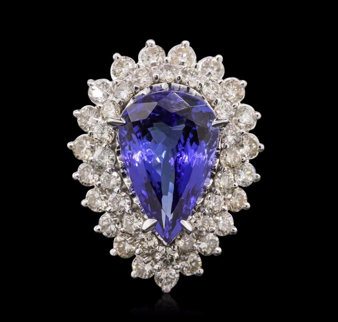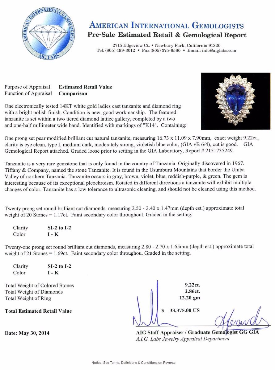 One electronically tested 14KT white gold ladies cast tanzanite and diamond ring with a bright polish finish. Condition is new, good workmanship. The featured tanzanite is set within a two tiered diamond lattice gallery, completed by a two and one-half millimeter wide band. Identified with markings of "K14". Containing: One prong set pear modified brilliant cut natural tanzanite, measuring 16.73 x 11.09 x 7.90mm, exact weight 9.22ct., clarity is eye clean, type I, medium dark, moderately strong, violetish blue color, (GIA vB 6/4), cut is good. GIA Gemological Report attached. Graded loose prior to setting in the GIA Laboratory, Report # 2151735249.Tanzanite is a very rare gemstone that is only found in the country of Tanzania. Originally discovered in 1967. Tiffany & Company, named the stone Tanzanite. It is found in the Usumburu Mountains that border the Umba Valley of northern Tanzania. Tanzanite occurs in gray, brown, violet, blue, reddish-purple, & green. The gem is interesting because of its exceptional pleochroism. Rotated in different directions a tanzanite will exhibit multiple changes of color. Tanzanite has a low tolerance to ultrasonic cleaning, and should not be cleaned using this method. Twenty prong set round brilliant cut diamonds, measuring 2.50 - 2.40 x 1.47mm (depth est.) approximate. Total Weight of 20 Stones = 1.17ct. Faint secondary color throughout. Graded in the setting. Clarity: SI-2 to I-2. Color: I - K Twenty-One prong set round brilliant cut diamonds, measuring 2.80 - 2.70 x 1.65mm (depth est.) approximate. Total Weight of 21 Stones = 1.69ct. Faint secondary color throughout. Graded in the setting. Clarity: SI-2 to I-2. Color: I - K. Total Weight of Colored Stones 9.22ct. Total Weight of Diamonds 2.86ct. Total Weight of Ring 12.20 grams. AIG Appraised at $33,375.00.