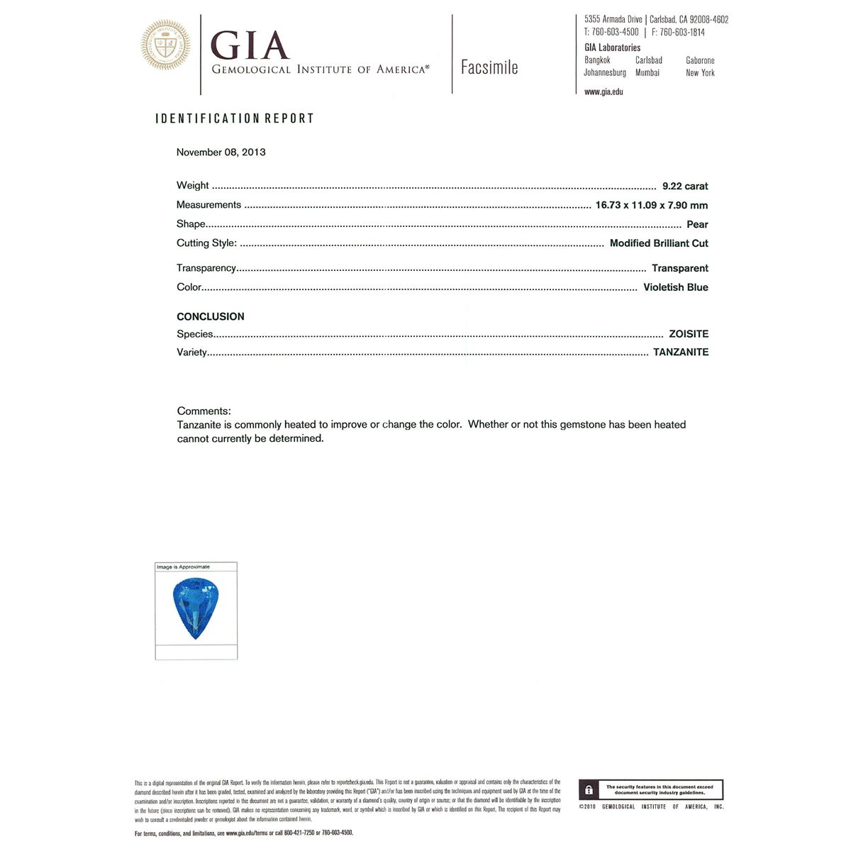 One electronically tested 14KT white gold ladies cast tanzanite and diamond ring with a bright polish finish. Condition is new, good workmanship. The featured tanzanite is set within a two tiered diamond lattice gallery, completed by a two and one-half millimeter wide band. Identified with markings of "K14". Containing: One prong set pear modified brilliant cut natural tanzanite, measuring 16.73 x 11.09 x 7.90mm, exact weight 9.22ct., clarity is eye clean, type I, medium dark, moderately strong, violetish blue color, (GIA vB 6/4), cut is good. GIA Gemological Report attached. Graded loose prior to setting in the GIA Laboratory, Report # 2151735249.Tanzanite is a very rare gemstone that is only found in the country of Tanzania. Originally discovered in 1967. Tiffany & Company, named the stone Tanzanite. It is found in the Usumburu Mountains that border the Umba Valley of northern Tanzania. Tanzanite occurs in gray, brown, violet, blue, reddish-purple, & green. The gem is interesting because of its exceptional pleochroism. Rotated in different directions a tanzanite will exhibit multiple changes of color. Tanzanite has a low tolerance to ultrasonic cleaning, and should not be cleaned using this method. Twenty prong set round brilliant cut diamonds, measuring 2.50 - 2.40 x 1.47mm (depth est.) approximate. Total Weight of 20 Stones = 1.17ct. Faint secondary color throughout. Graded in the setting. Clarity: SI-2 to I-2. Color: I - K Twenty-One prong set round brilliant cut diamonds, measuring 2.80 - 2.70 x 1.65mm (depth est.) approximate. Total Weight of 21 Stones = 1.69ct. Faint secondary color throughout. Graded in the setting. Clarity: SI-2 to I-2. Color: I - K. Total Weight of Colored Stones 9.22ct. Total Weight of Diamonds 2.86ct. Total Weight of Ring 12.20 grams. AIG Appraised at $33,375.00.