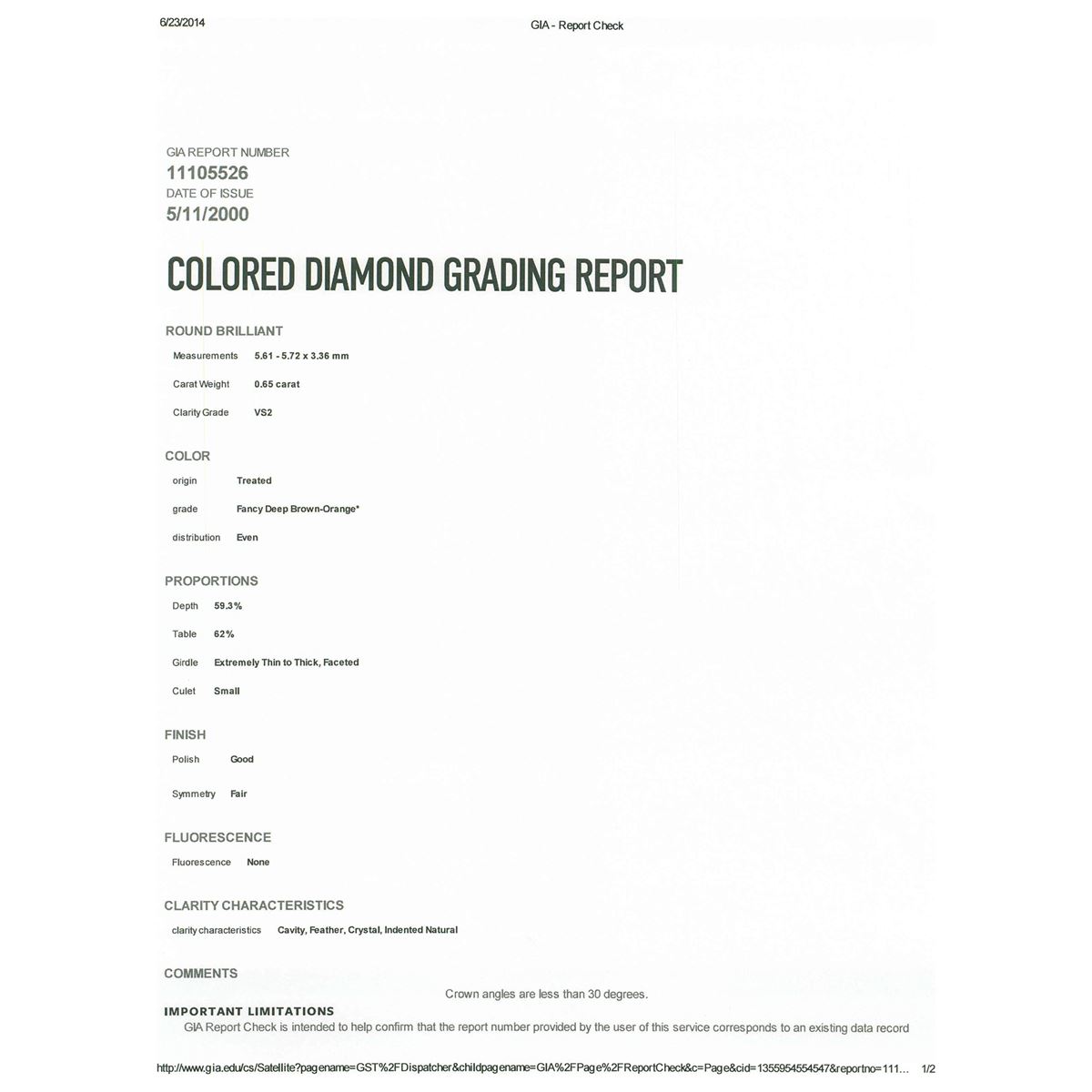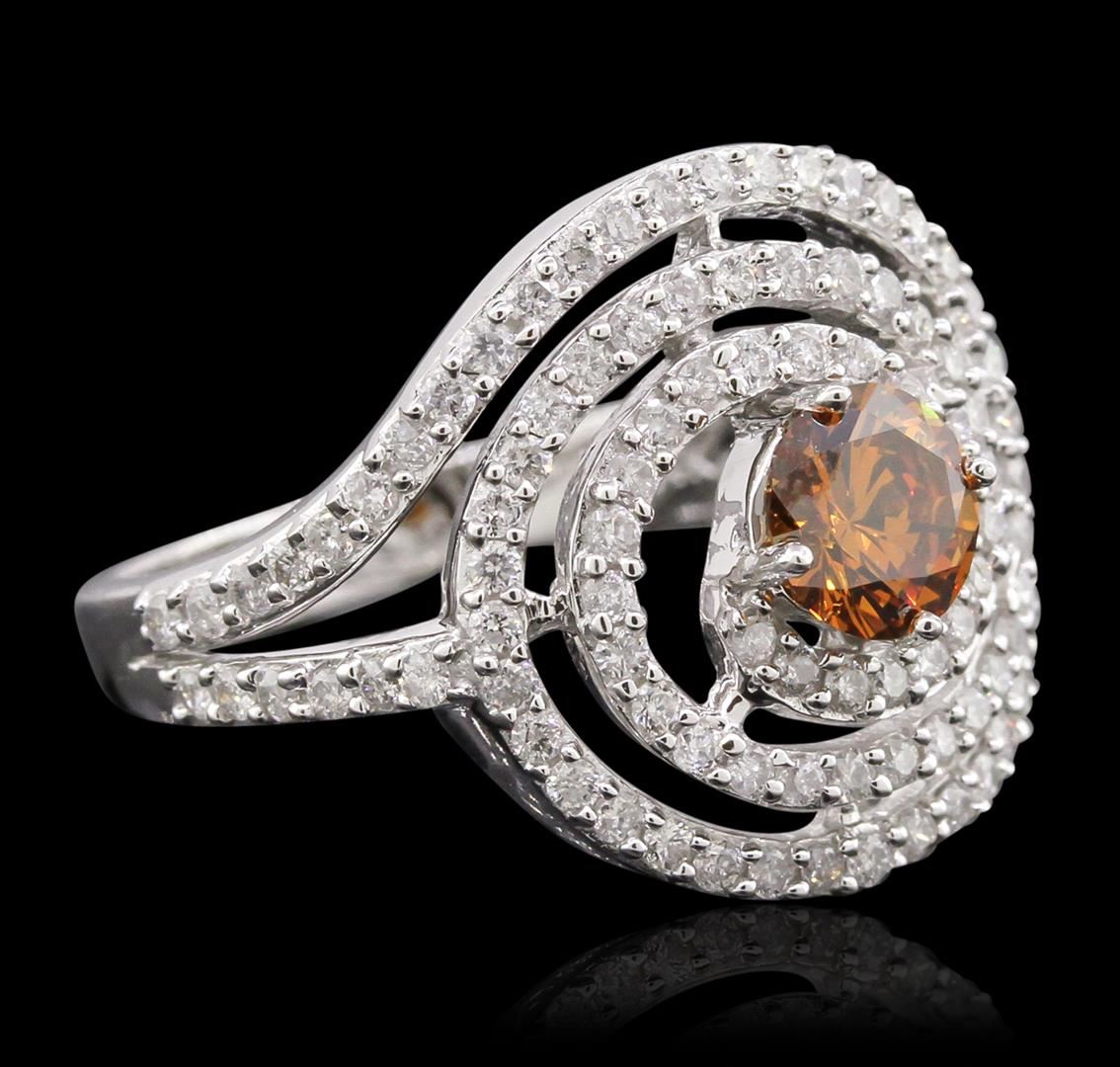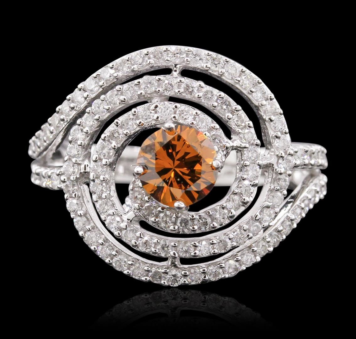 One electronically tested 14KT white gold ladies cast diamond ring with a bright polish finish. Condition is new, good workmanship. The featured diamond is set within swirling diamond bezels supported by diamond set split shoulders, completed by a two and one-half millimeter wide band. Trademark is Orianne. Identified with markings of "14K". Containing: One prong set round brilliant cut diamond, measuring 5.61 - 5.72 x 3.36mm exact weight 0.65ct. GIA Diamond Grading Report attached. Indications of laboratory irradiated enhanced color. Graded loose in the GIA Laboratory, Report #11105526. Clarity VS-2. Color: Fancy Deep Brown-Orange. Depth: 59.3%. Table: 62.0%. One Hundred Four prong set round brilliant cut diamonds, measuring 1.20 - 1.10 x 0.69mm (depth est.) approximate total weight of 104 Stones = 0.67ct. Graded in the setting. Clarity: I-1 to I-2. Color: G - I. Total Weight of Diamonds 1.32ct. Total Weight of Ring 5.34gm. AIG Appraised at $6,995.00.