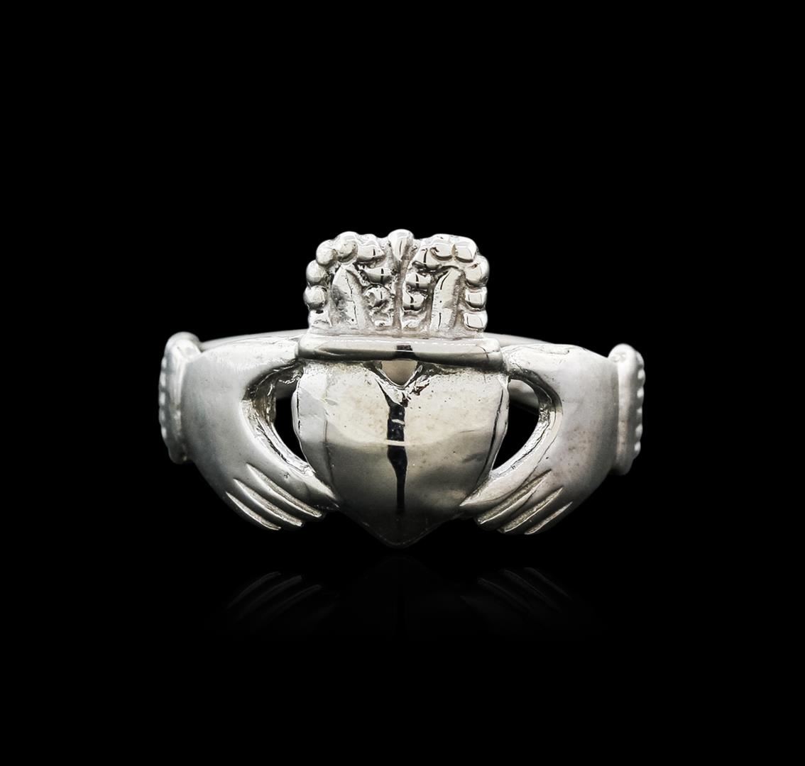 One heart and crown ring featuring: 14KT white gold weighing 3.00 grams.