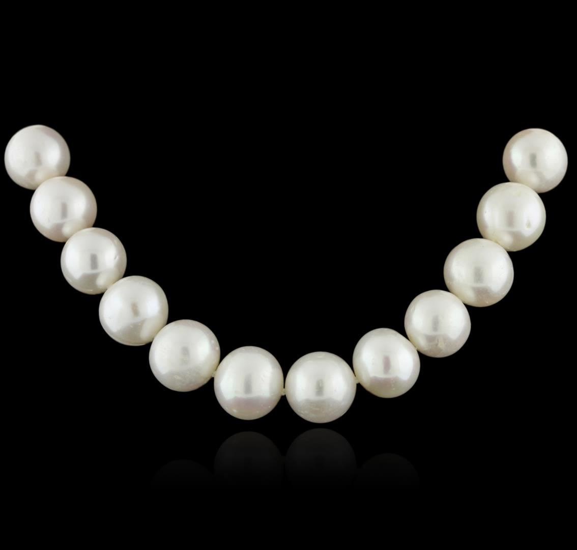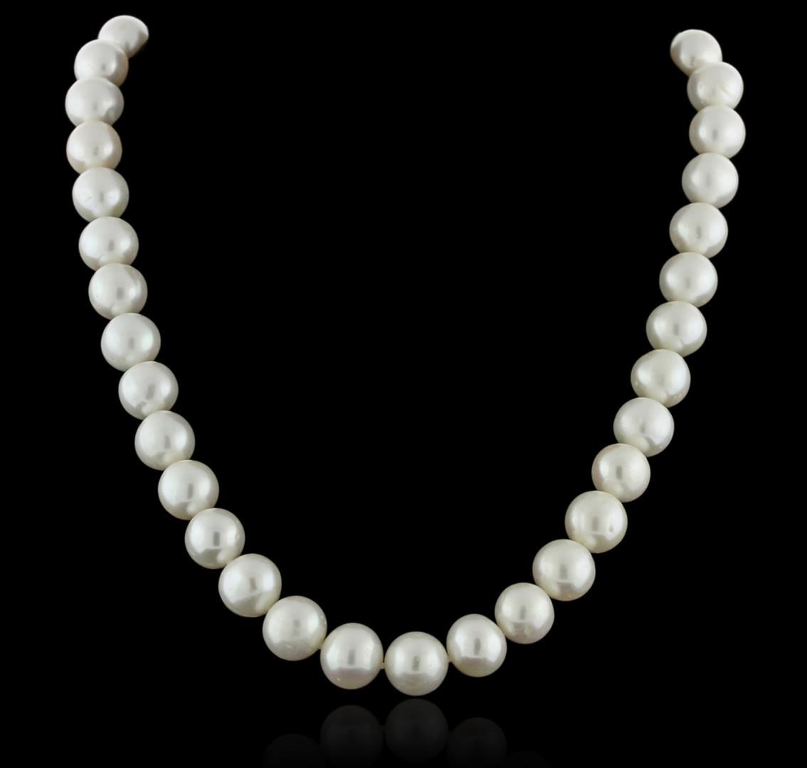 One necklace featuring: 14KT white gold weighing 70.07 grams containing 38 fresh water pearls measuring 11mm.