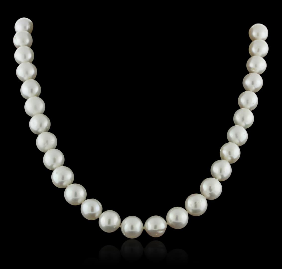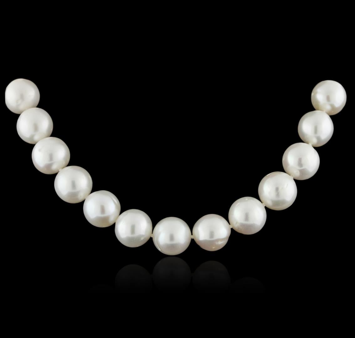 One necklace featuring: 14KT white gold weighing 67.74 grams containing 38 fresh water pearls measuring 11mm.