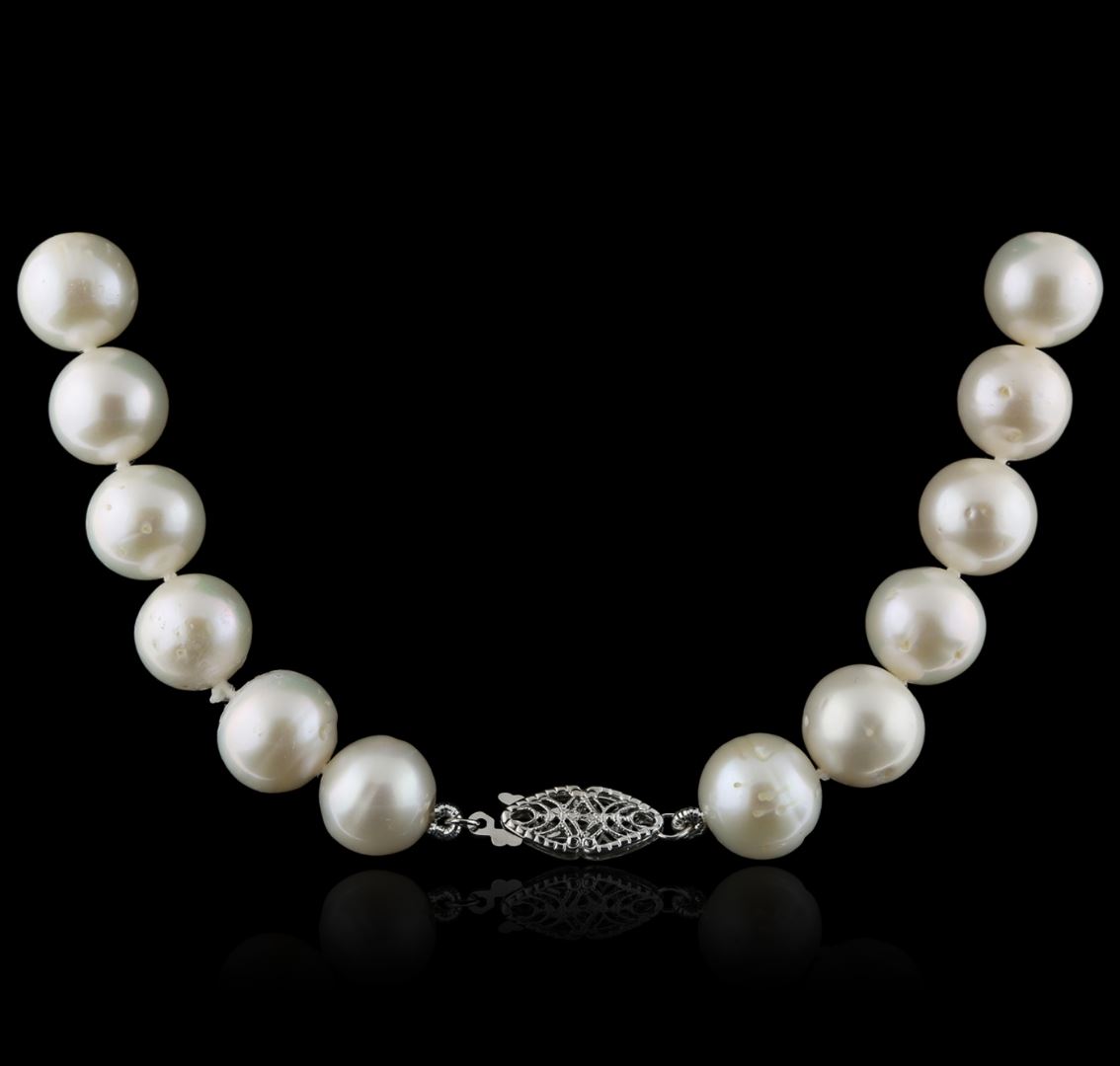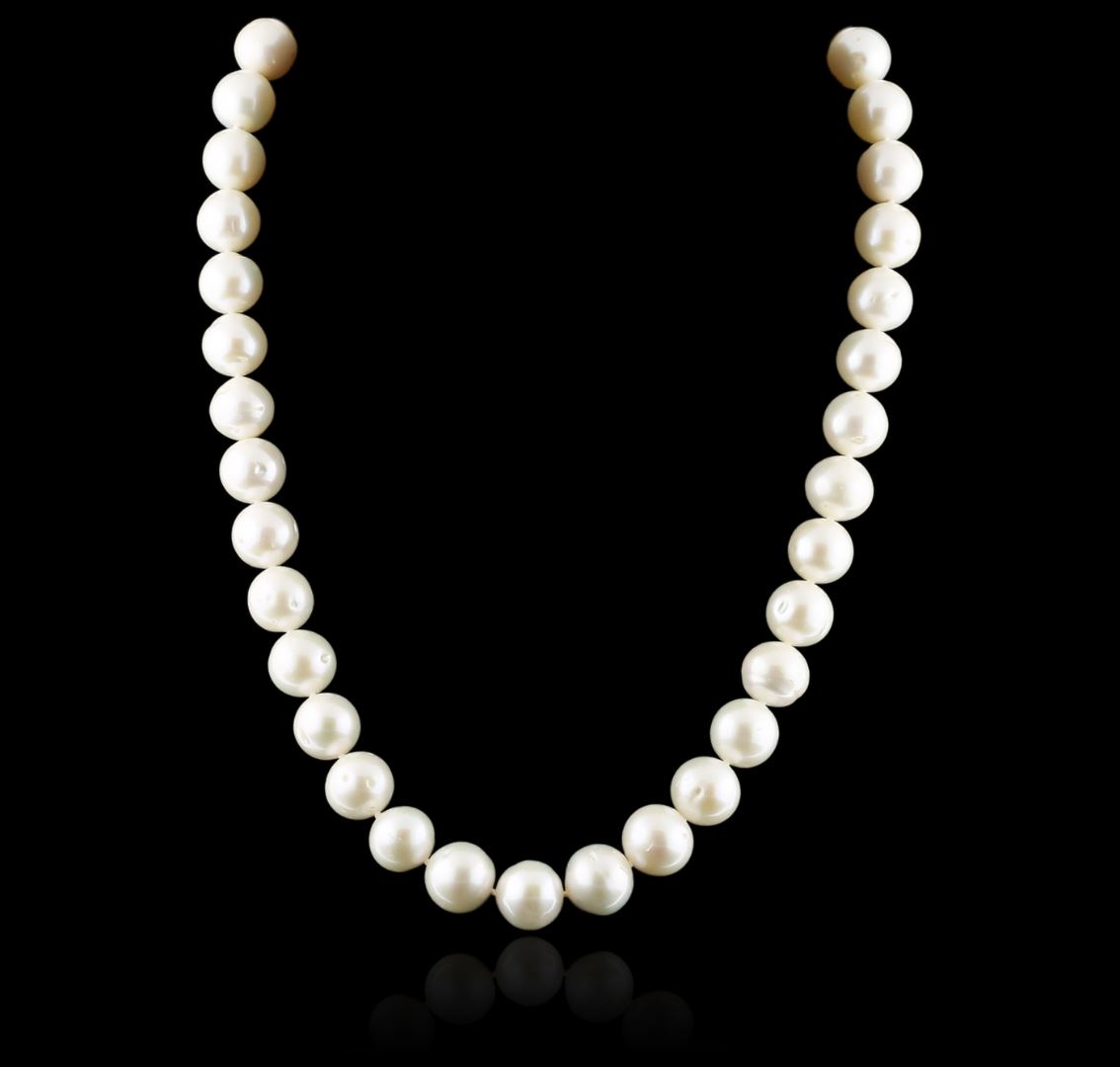 One necklace featuring: 14KT white gold weighing 64.32 grams containing 38 fresh water pearls measuring 11mm.
