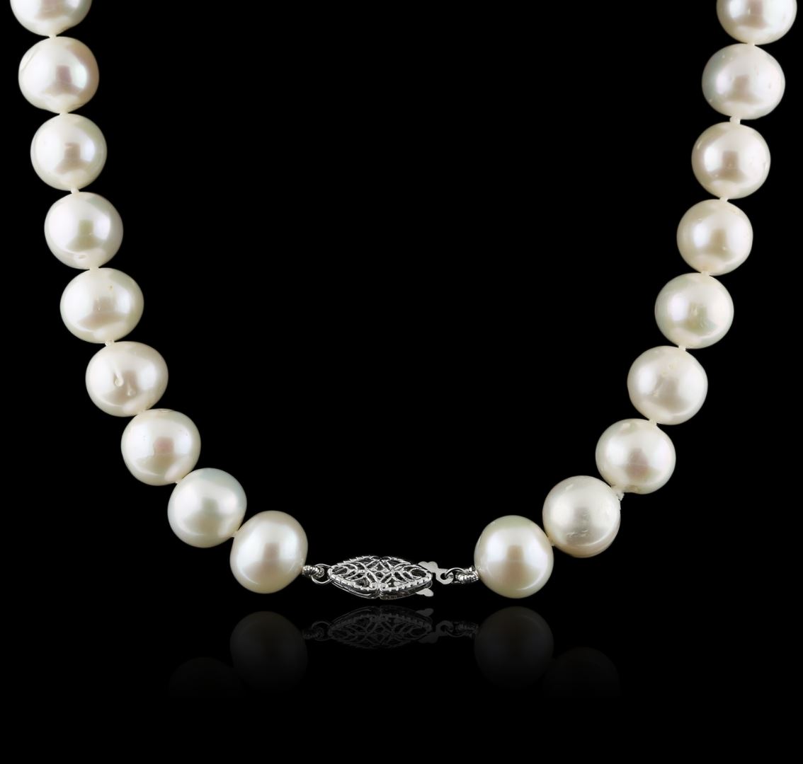 One necklace featuring: 14KT white gold weighing 69.79 grams containing 38 fresh water pearls measuring 11mm.