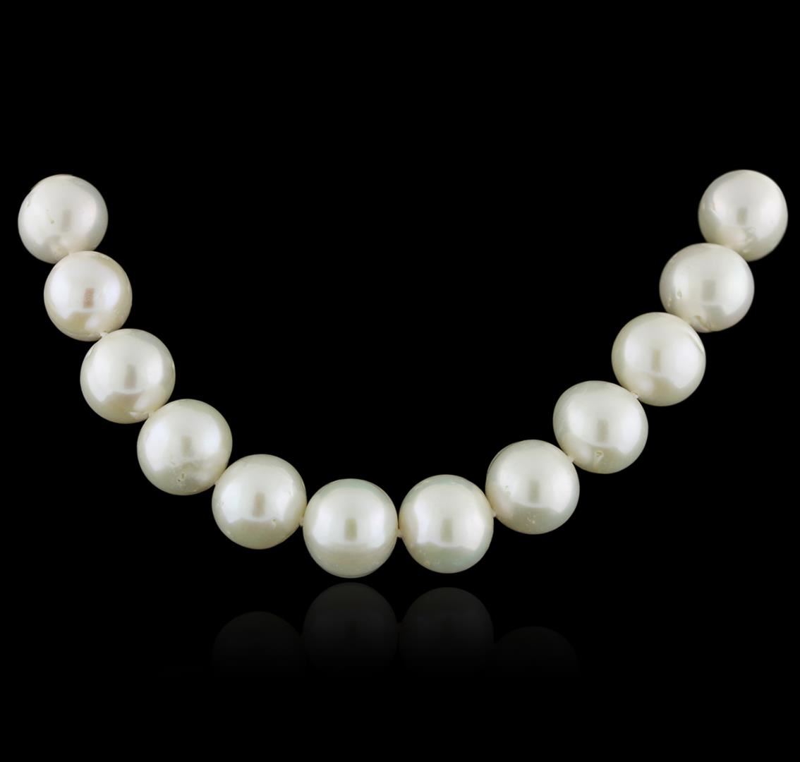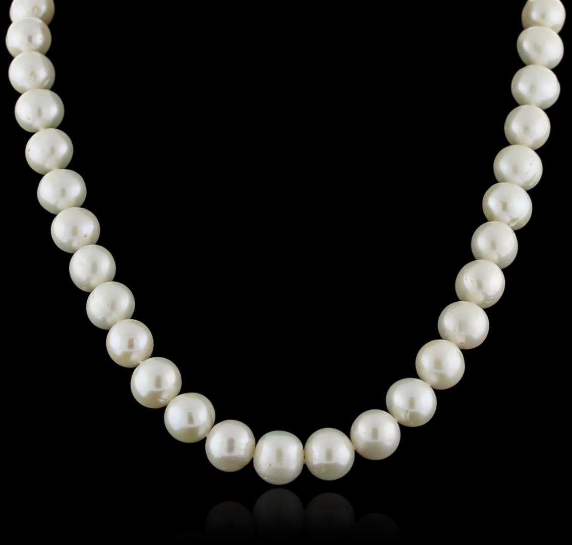 One necklace featuring: 14KT white gold weighing 71.05 grams containing 38 fresh water pearls measuring 11mm.