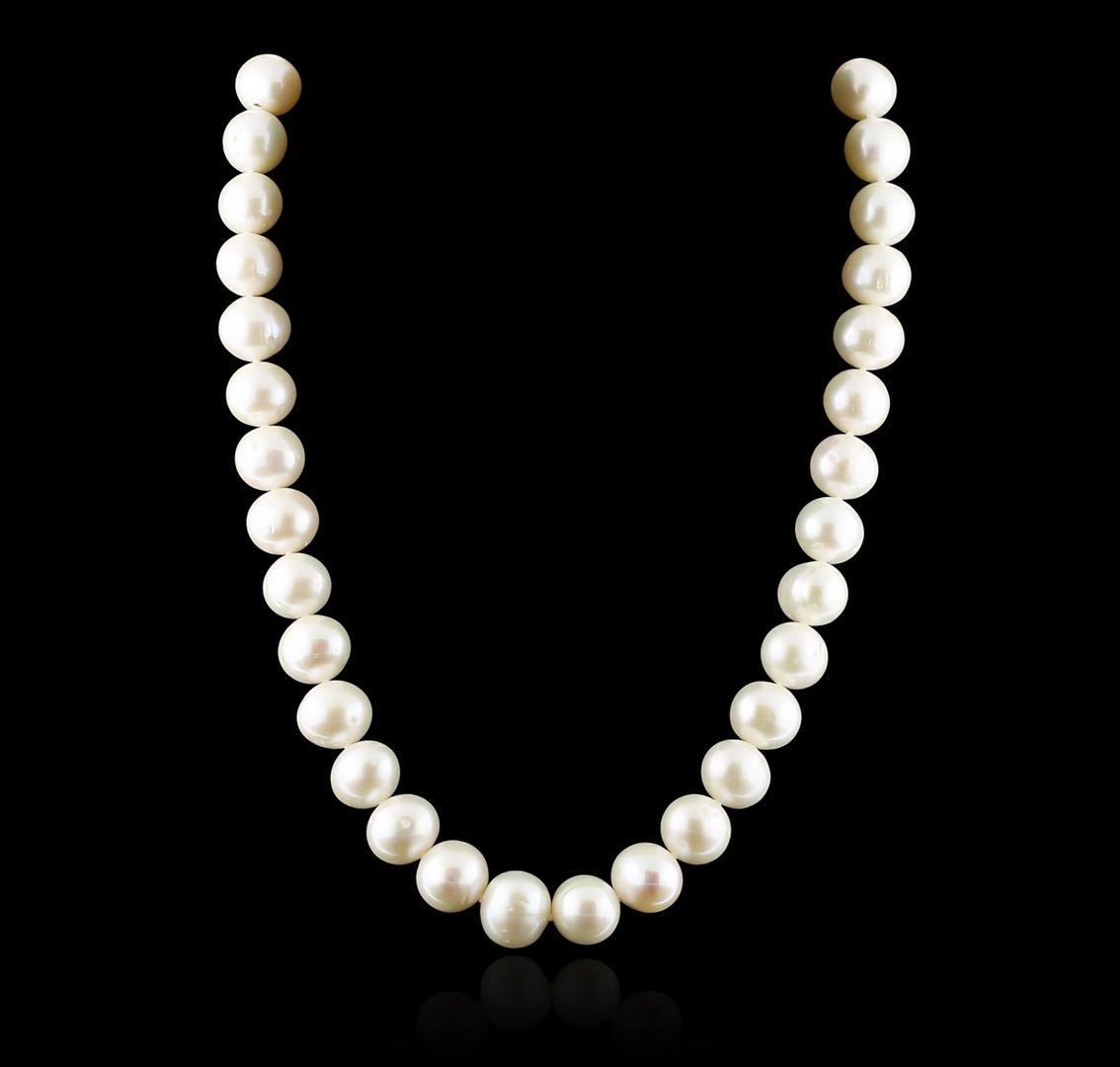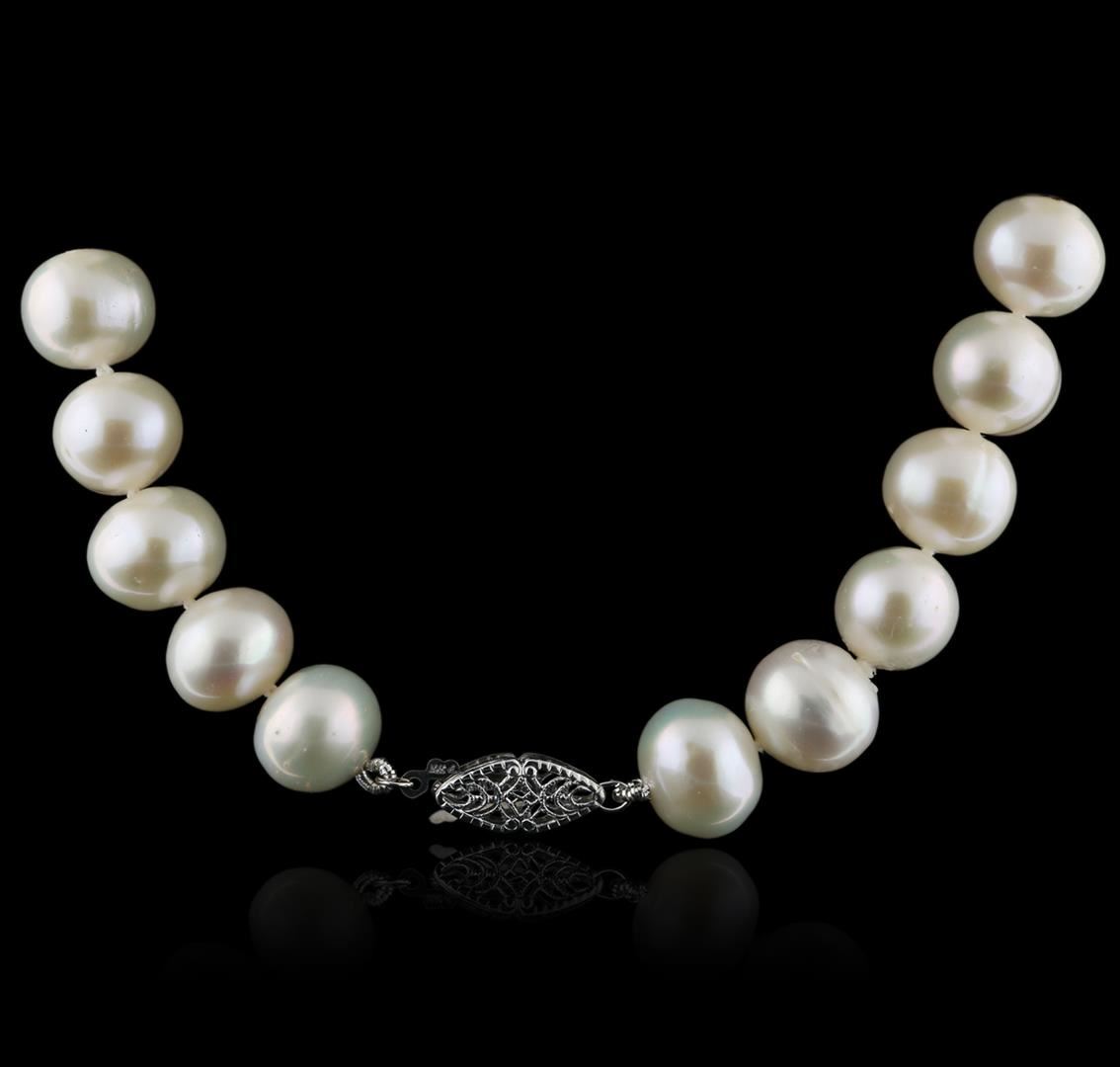 One necklace featuring: 14KT white gold weighing 70.77 grams containing 38 fresh water pearls measuring 11mm.