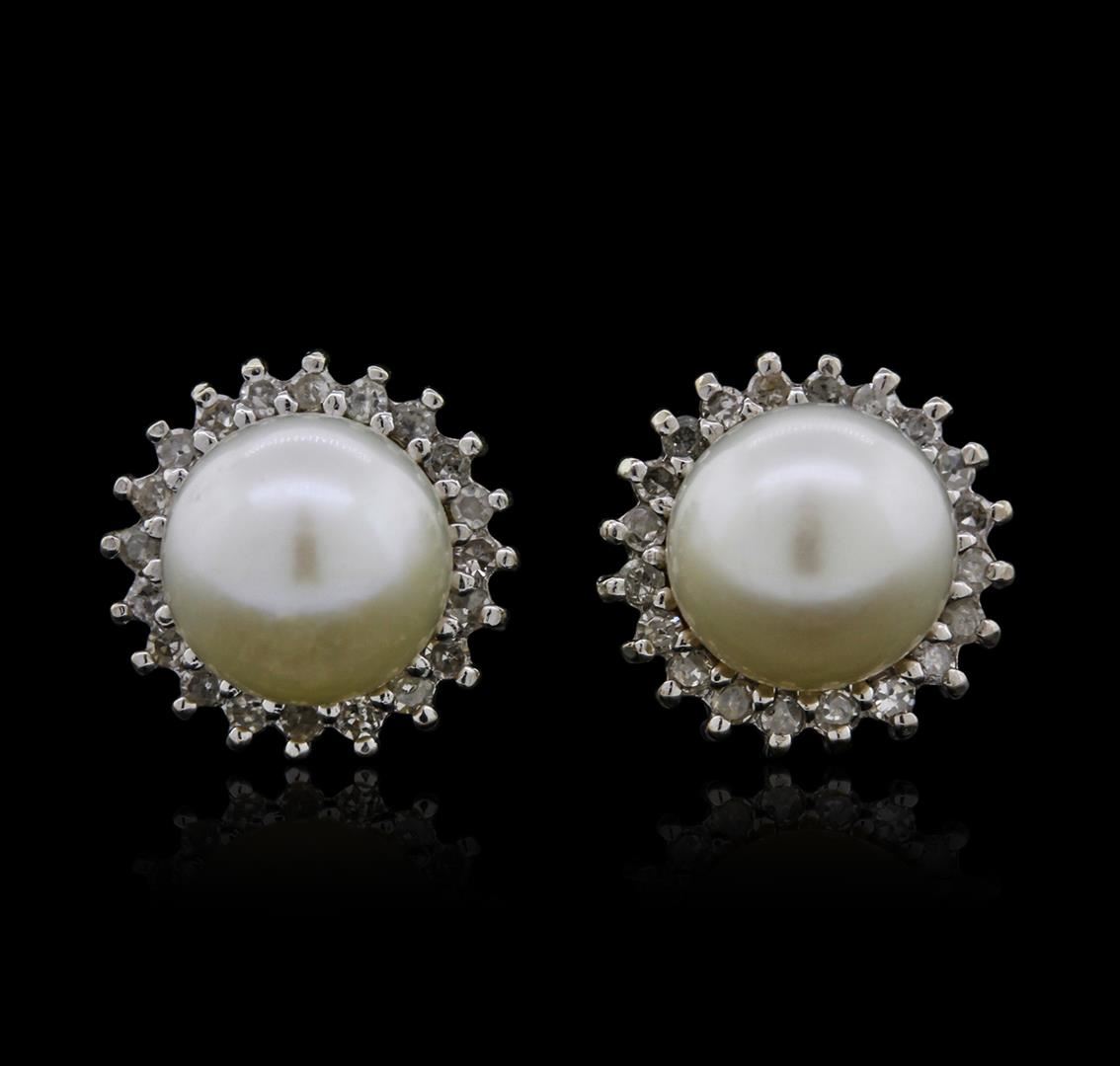 One pair of earrings featuring: 14KT white gold weighing 3.00 grams containing two 7.5mm pearls and diamonds with a total weight of 0.40ct.