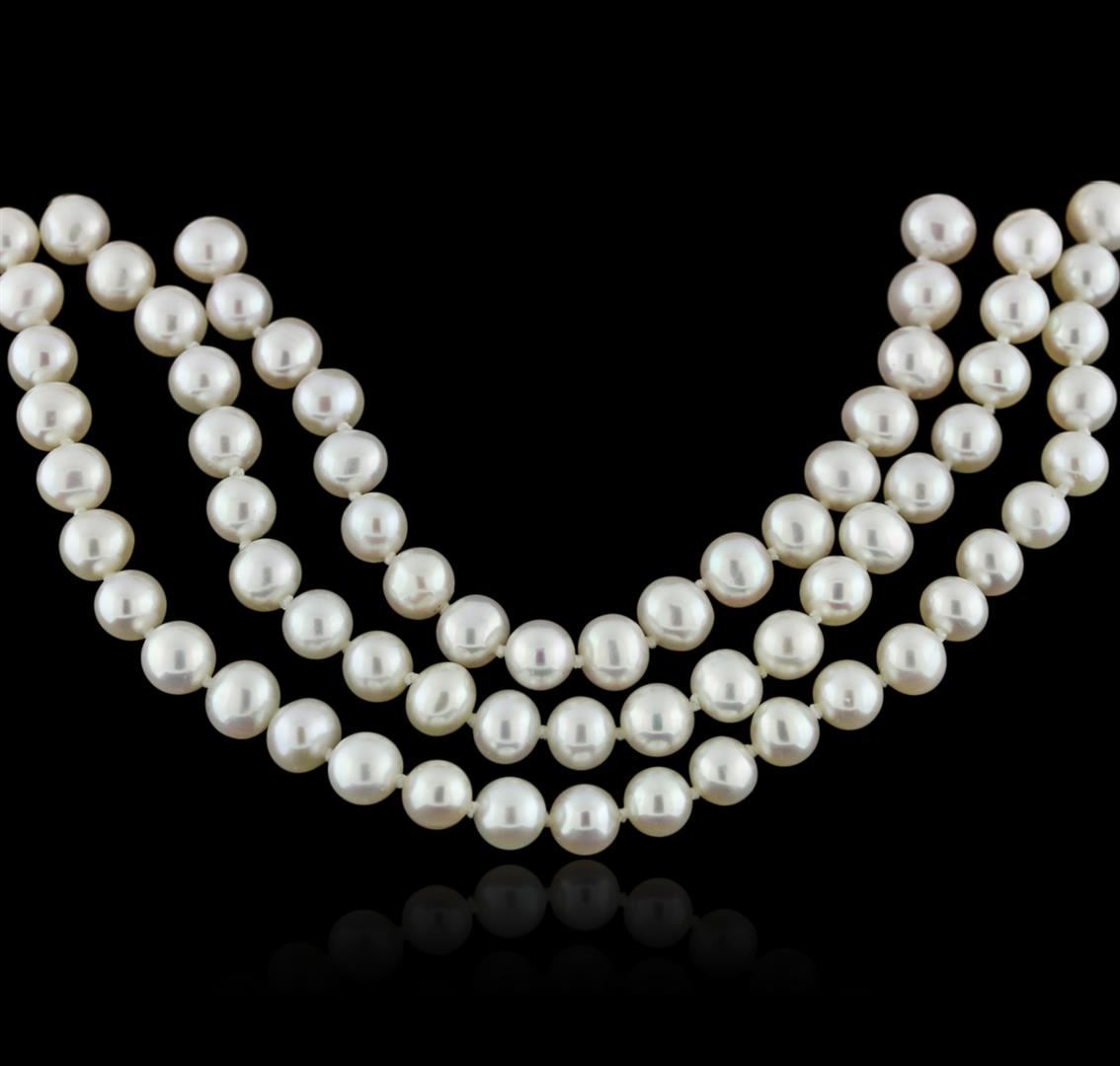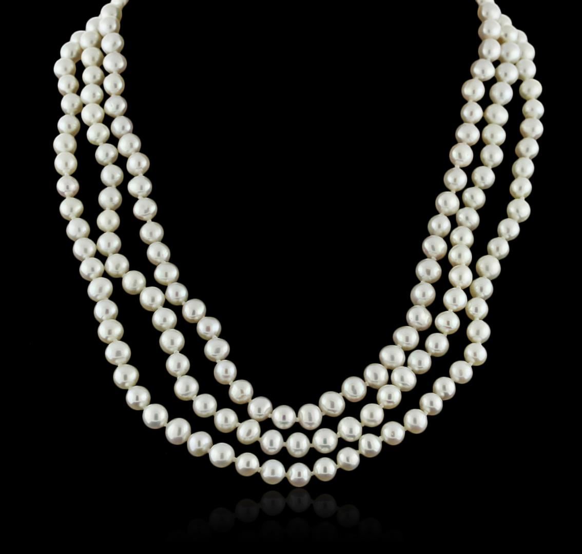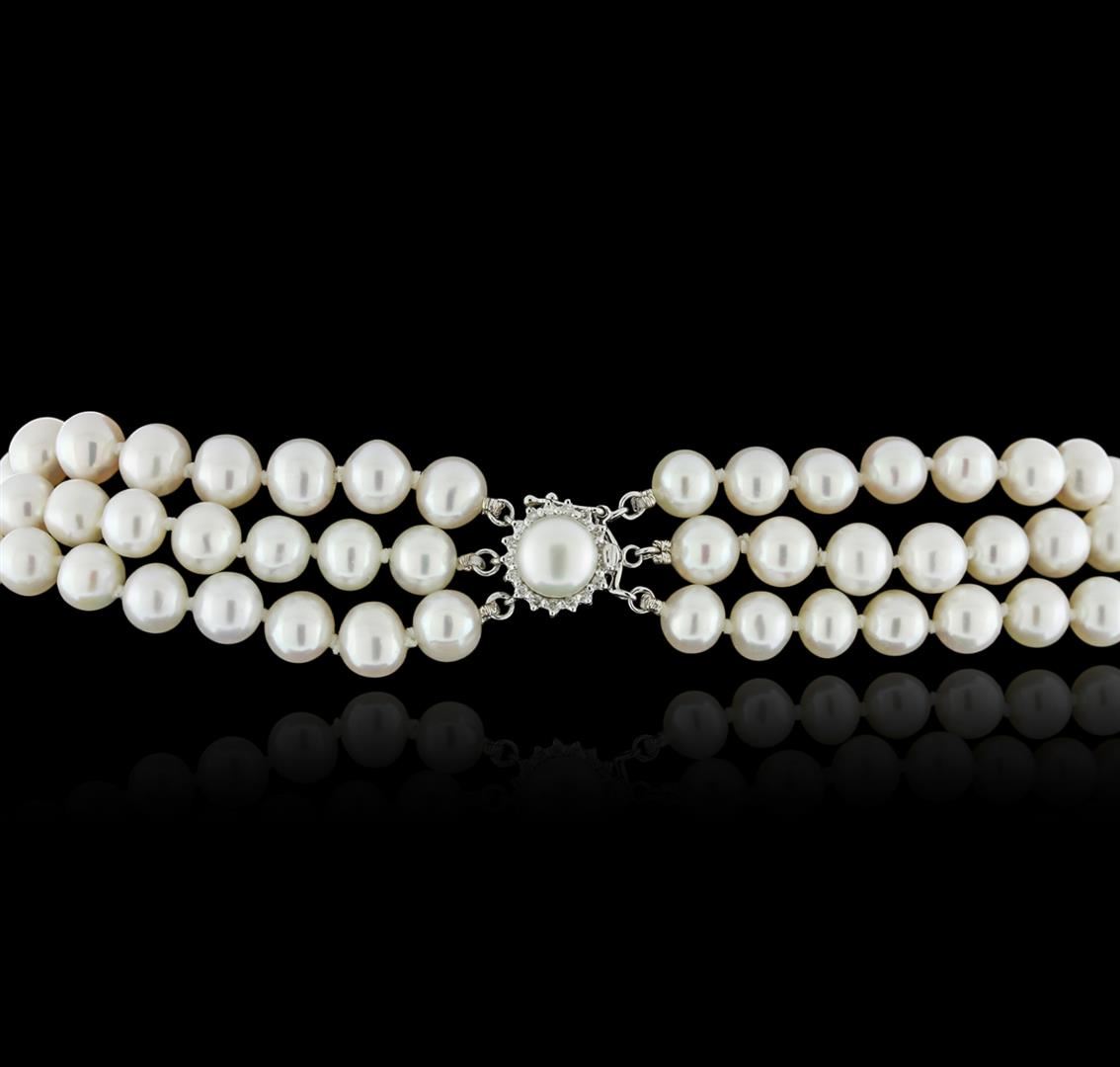 One necklace featuring: 14KT white gold weighing 66.56 grams containing three rows of 6-7mm fresh water pearls and 17 diamonds with a total weight of 0.09ct.