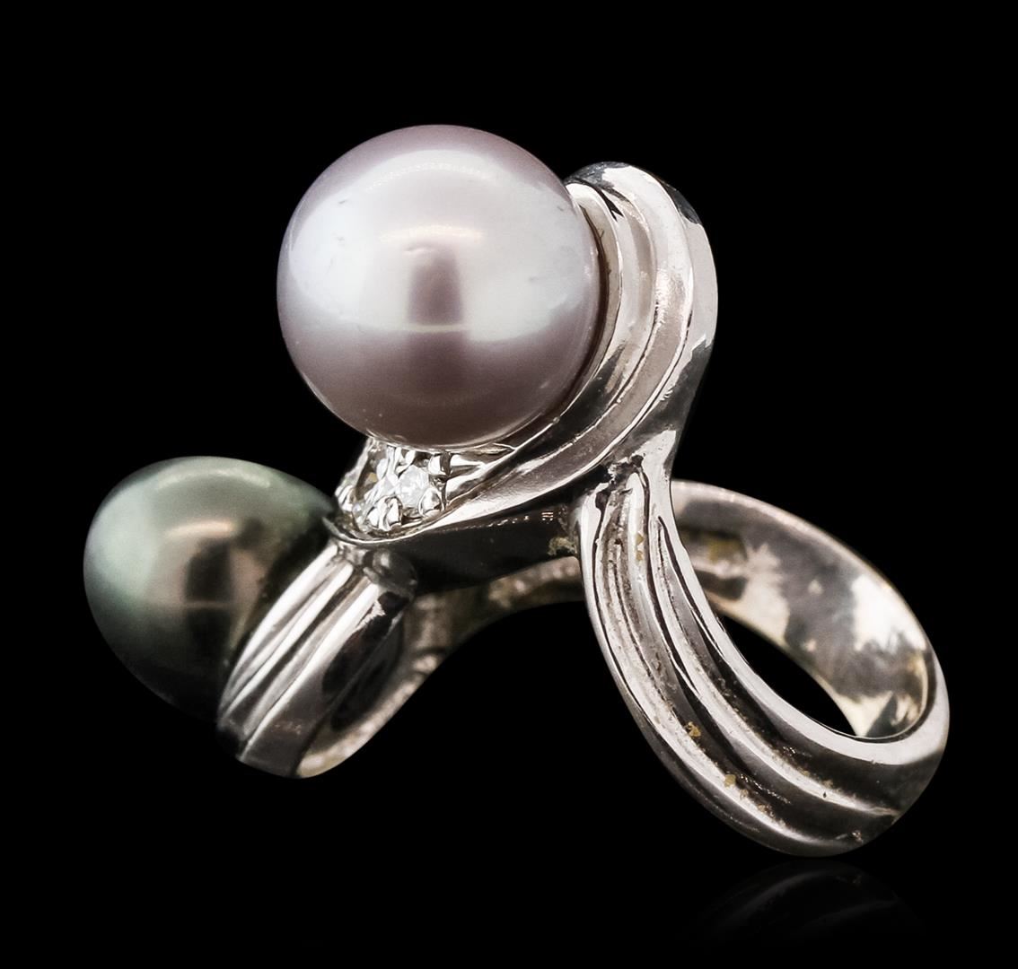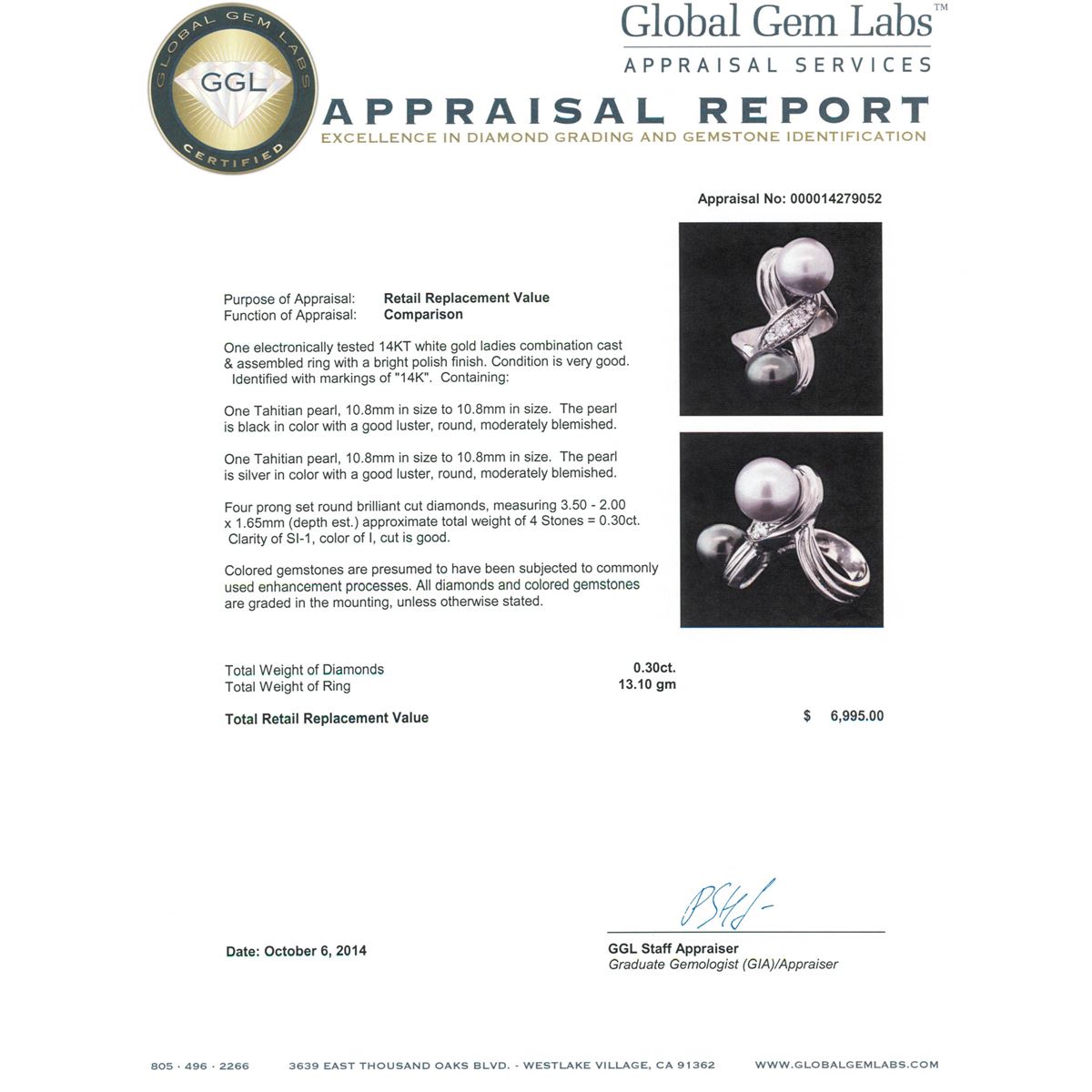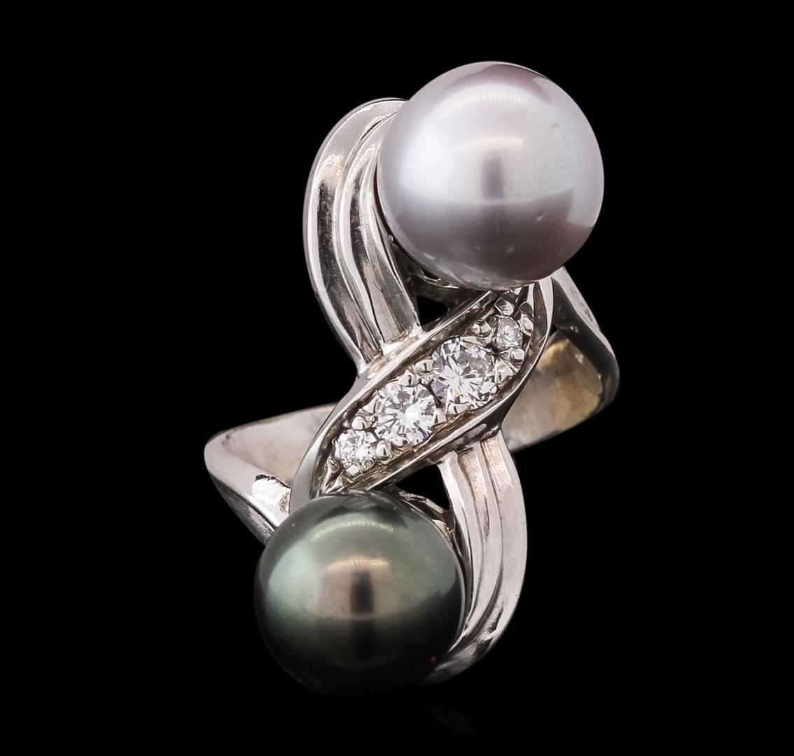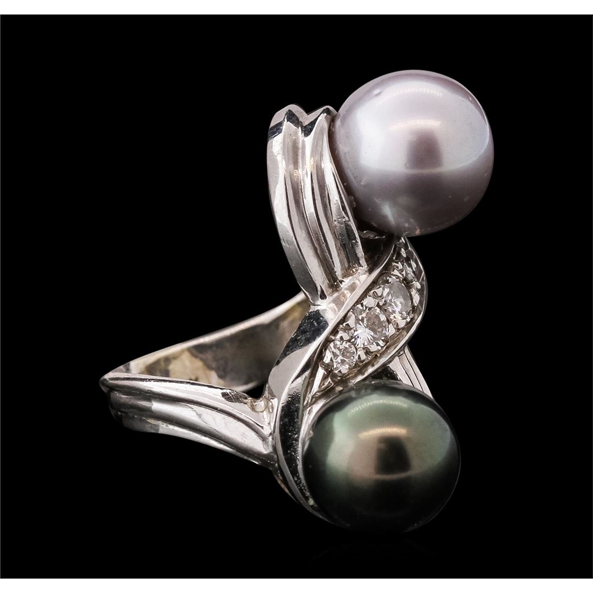 One electronically tested 14KT white gold ladies combination cast & assembled ring with a bright polish finish. Identified with markings of "14K". Condition is very good. Containing: One Tahitian pearl, 10.8mm in size to 10.8mm in size. The pearl is black in color with a good luster, round, moderately blemished. One Tahitian pearl, 10.8mm in size to 10.8mm in size. The pearl is silver in color with a good luster, round, moderately blemished. Four prong set round brilliant cut diamonds, measuring 3.50 - 2.00 x 1.65mm (depth est.) approximate total weight of 4 Stones = 0.30ct. Clarity: SI-1. Color: I, Cut is Good. Colored gemstones are presumed to have been subjected to commonly used enhancement processes. All diamonds and colored gemstones are graded in the mounting, unless otherwise stated. Total Weight of Diamonds 0.30ct. Total Weight of Ring 13.10 grams. GGL Appraised at $6,995.00.