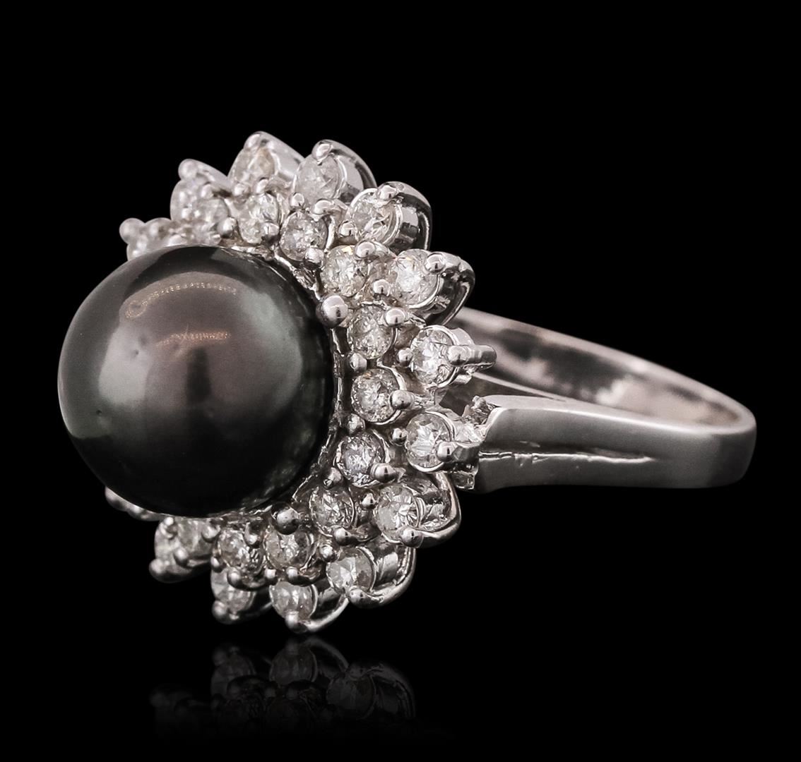 One electronically tested 14KT white gold ladies cast Tahitian cultured pearl & diamond ring with a bright finish. The featured Tahitian cultured pearl is set within a tiered diamond bezel, supported by a ribbed under gallery, completed by a two millimeter wide band. Identified with markings of "K14". Condition is good. Containing: One black Tahitian cultured pearl, 10.0mm in size. The pearl is black in color and exhibiting orient with a medium luster, mostly round, lightly spotted Indications of resin residue on the post. This resin is a usual & customary setting tool for pearls. Graded in the setting. Tahitian cultured pearls form in the large "Black Lipped" Pinctada Margaritifera oyster, which is about twice the size of the Japanese Akoya oyster. This warm water species from across the central and South Pacific Ocean is at home in the bays and lagoons of the islands & atolls of French Polynesia. Tahitian cultured pearl farmers generally raise their oysters in lagoons. Tahitian cultured pearls take from two to four years to form. Black pearls are known for their iridescent, vibrant, almost metallic natural colors, unique among saltwater cultured pearls. Though commonly called "Tahitian" pearls, they are actually gray, to a lighter or darker degree. Tahitian pearls have the unique ability to display a variety of colors at the same time, which can be seen glistening on their surface. Thirty-Two prong set round brilliant cut diamonds, measuring 2.00 - 1.90 x 1.17mm (depth est.) approximate total weight of 32 Stones = 0.86ct. Graded in the setting. Clarity: I-1 to I-2. Color: G - I. Total Weight of Diamonds 0.86ct. Total Weight of Ring 8.15 grams. AIG Appraised at $3,990.00.