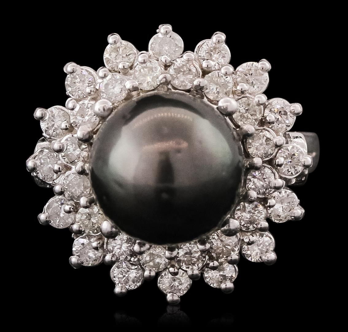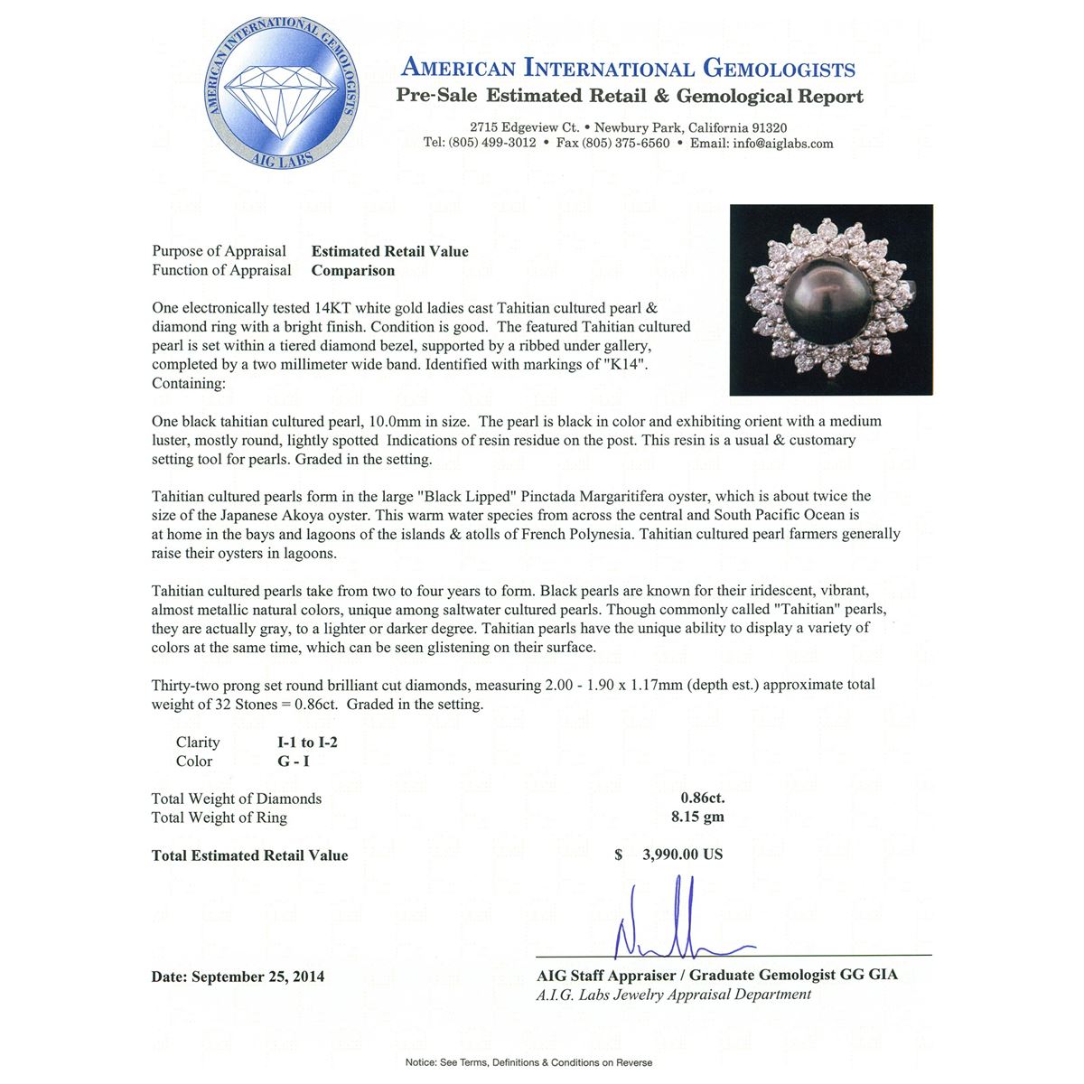 One electronically tested 14KT white gold ladies cast Tahitian cultured pearl & diamond ring with a bright finish. The featured Tahitian cultured pearl is set within a tiered diamond bezel, supported by a ribbed under gallery, completed by a two millimeter wide band. Identified with markings of "K14". Condition is good. Containing: One black Tahitian cultured pearl, 10.0mm in size. The pearl is black in color and exhibiting orient with a medium luster, mostly round, lightly spotted Indications of resin residue on the post. This resin is a usual & customary setting tool for pearls. Graded in the setting. Tahitian cultured pearls form in the large "Black Lipped" Pinctada Margaritifera oyster, which is about twice the size of the Japanese Akoya oyster. This warm water species from across the central and South Pacific Ocean is at home in the bays and lagoons of the islands & atolls of French Polynesia. Tahitian cultured pearl farmers generally raise their oysters in lagoons. Tahitian cultured pearls take from two to four years to form. Black pearls are known for their iridescent, vibrant, almost metallic natural colors, unique among saltwater cultured pearls. Though commonly called "Tahitian" pearls, they are actually gray, to a lighter or darker degree. Tahitian pearls have the unique ability to display a variety of colors at the same time, which can be seen glistening on their surface. Thirty-Two prong set round brilliant cut diamonds, measuring 2.00 - 1.90 x 1.17mm (depth est.) approximate total weight of 32 Stones = 0.86ct. Graded in the setting. Clarity: I-1 to I-2. Color: G - I. Total Weight of Diamonds 0.86ct. Total Weight of Ring 8.15 grams. AIG Appraised at $3,990.00.