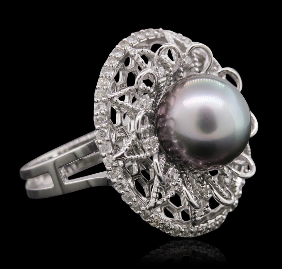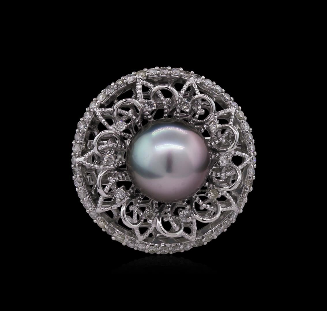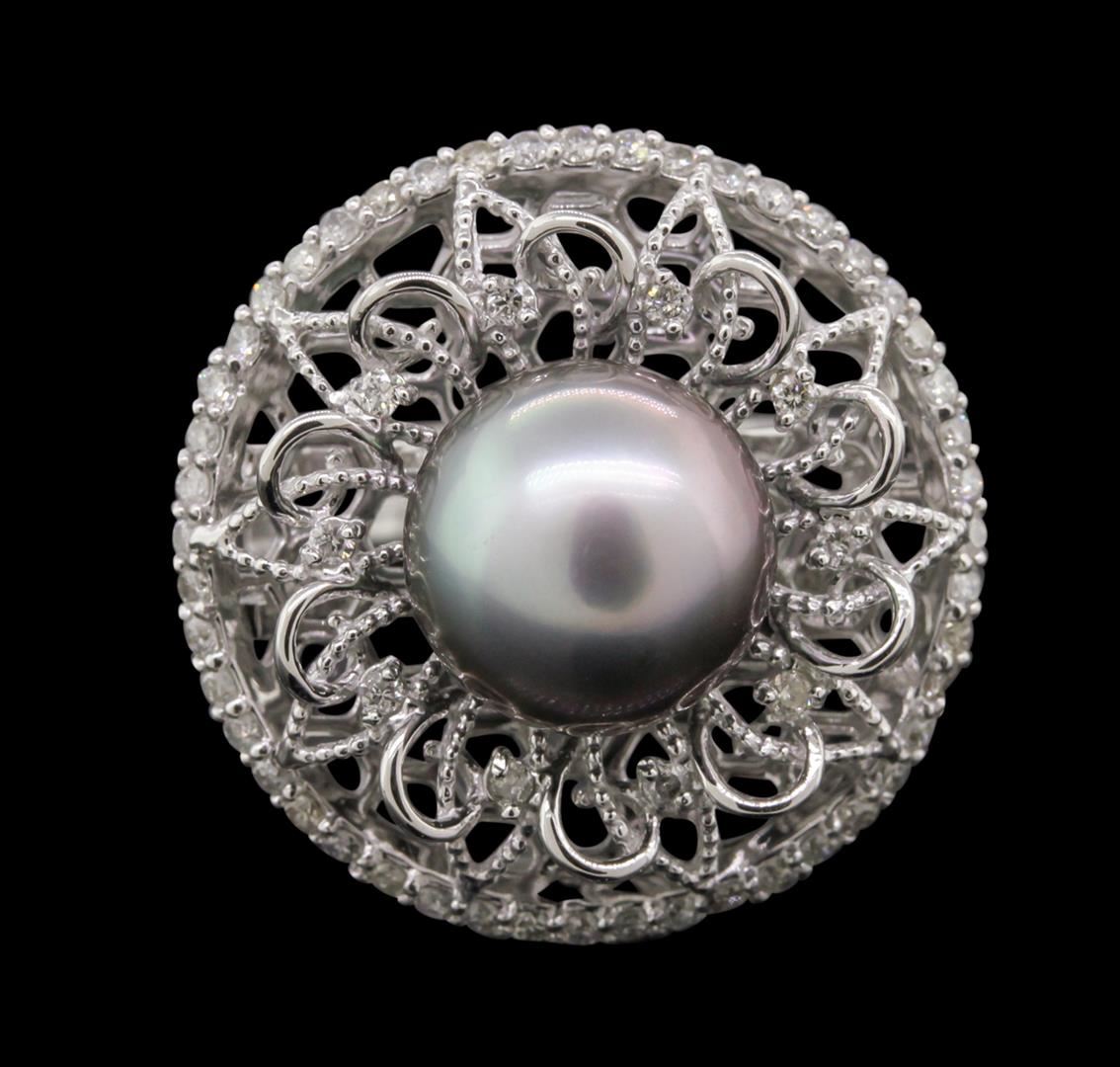 One electronically tested 14KT white gold Ladies ring with a bright polish finish. Condition is new. Identified with markings of "585". Containing: One Tahitian pearl, 10.6mm in size to 10.6mm in size. The pearl is silver in color with a good luster, round, moderately blemished. Sixty prong set round brilliant cut diamonds, measuring 1.30 - 1.20 x 0.75mm (depth est.) approximate. Total Weight of 60 Stones = 0.43ct. Clarity: I-1 to I-2. Color: I - J, Cut is Good. Total Weight of Diamonds 0.43ct. Total Weight of Ring 9.00 grams. GGL Appraised at $5,205.00.