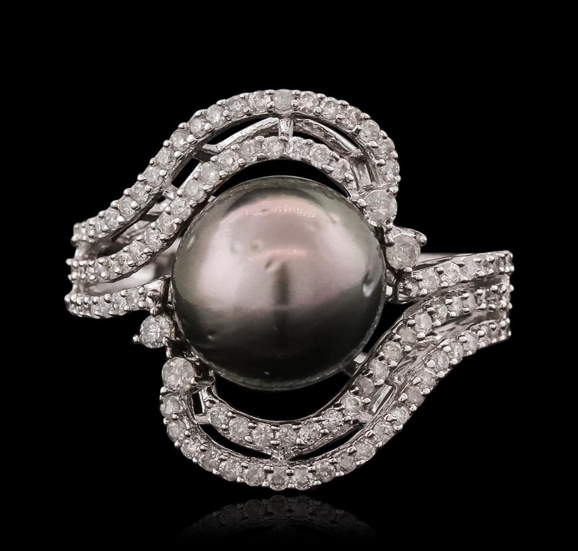 One electronically tested 14KT white gold ladies combination cast & assembled pearl and diamond ring with a split shank with a bright polish finish. Identified with markings of "14K". Condition is new. Containing: Ninety-Six prong set round brilliant cut diamonds, measuring 1.50 - 1.00 x 0.75mm (depth est.) approximate total weight of 96 Stones = 0.50ct. Clarity: I-1 to I-2. Color: I - J, Cut is Good. One Tahitian pearl, 10.2mm in size to 10.2mm in size. The pearl is black in color with a good luster, round, moderately blemished Colored gemstones are presumed to have been subjected to commonly used enhancement processes. All diamonds and colored gemstones are graded in the mounting, unless otherwise stated. Total Weight of Diamonds 0.50ct. Total Weight of Ring 5.50 grams. GGL Appraised at $3,575.00.