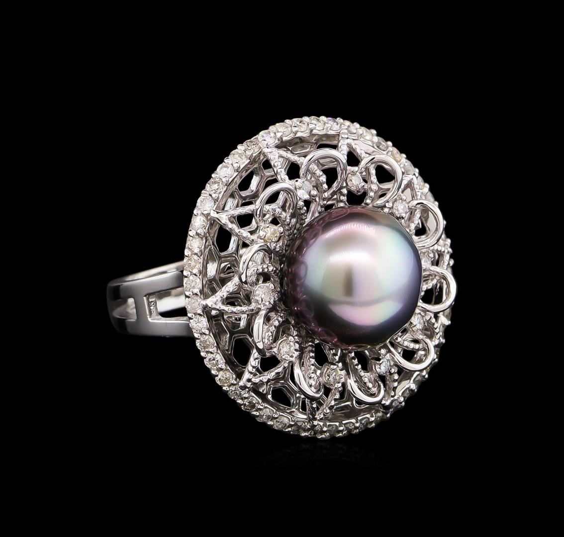 One electronically tested 14KT white gold Ladies ring with a bright polish finish. Condition is new. Identified with markings of "585". Containing: One Tahitian pearl, 10.6mm in size to 10.6mm in size. The pearl is silver in color with a good luster, round, moderately blemished. Sixty prong set round brilliant cut diamonds, measuring 1.30 - 1.20 x 0.75mm (depth est.) approximate. Total Weight of 60 Stones = 0.43ct. Clarity: I-1 to I-2. Color: I - J, Cut is Good. Total Weight of Diamonds 0.43ct. Total Weight of Ring 9.00 grams. GGL Appraised at $5,205.00.