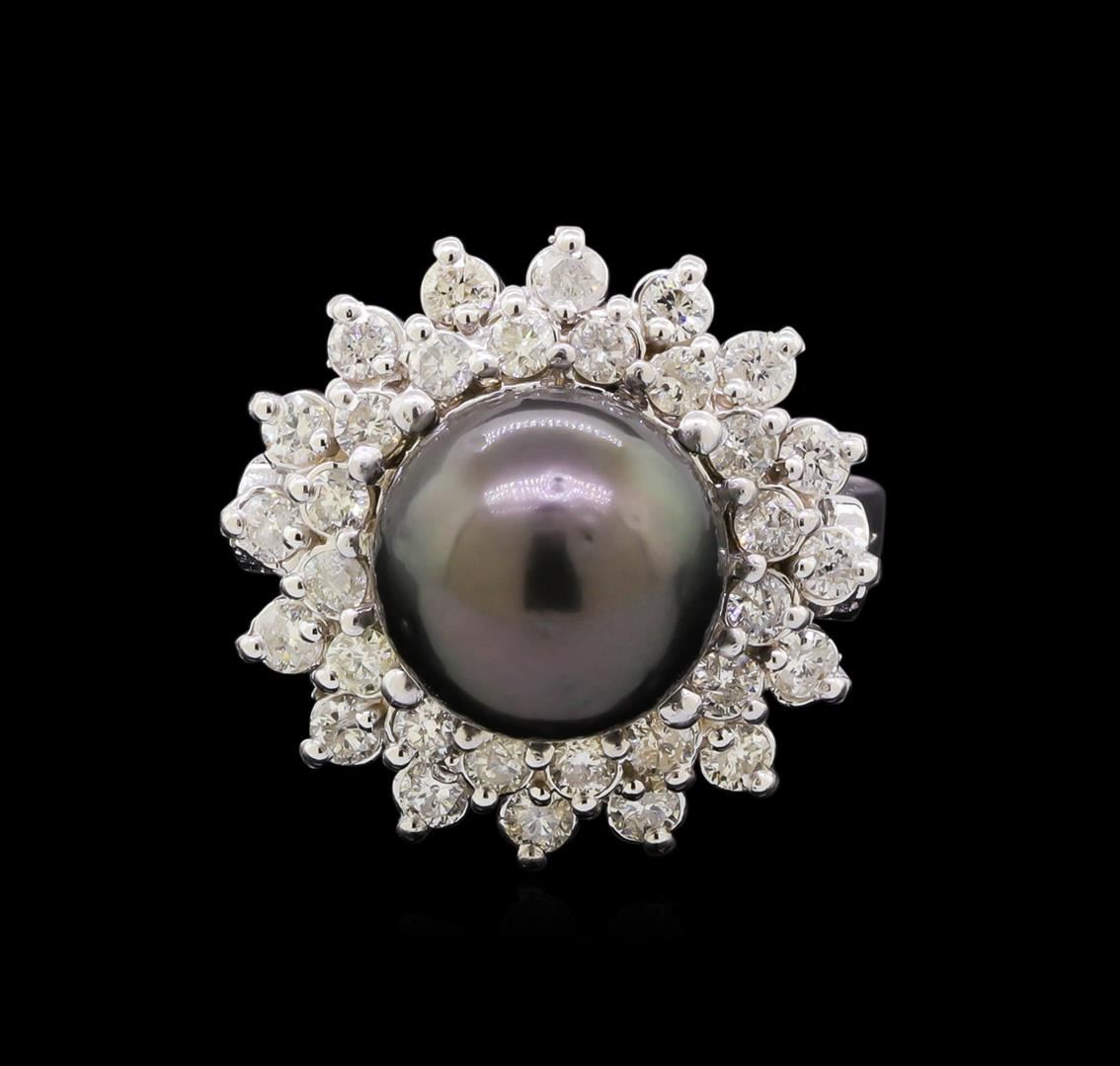 One electronically tested 14KT white gold ladies cast Tahitian cultured pearl & diamond ring with a bright finish. The featured Tahitian cultured pearl is set within a tiered diamond bezel, supported by a ribbed under gallery, completed by a two millimeter wide band. Identified with markings of "K14". Condition is good. Containing: One black Tahitian cultured pearl, 10.0mm in size. The pearl is black in color and exhibiting orient with a medium luster, mostly round, lightly spotted Indications of resin residue on the post. This resin is a usual & customary setting tool for pearls. Graded in the setting. Tahitian cultured pearls form in the large "Black Lipped" Pinctada Margaritifera oyster, which is about twice the size of the Japanese Akoya oyster. This warm water species from across the central and South Pacific Ocean is at home in the bays and lagoons of the islands & atolls of French Polynesia. Tahitian cultured pearl farmers generally raise their oysters in lagoons. Tahitian cultured pearls take from two to four years to form. Black pearls are known for their iridescent, vibrant, almost metallic natural colors, unique among saltwater cultured pearls. Though commonly called "Tahitian" pearls, they are actually gray, to a lighter or darker degree. Tahitian pearls have the unique ability to display a variety of colors at the same time, which can be seen glistening on their surface. Thirty-Two prong set round brilliant cut diamonds, measuring 2.00 - 1.90 x 1.17mm (depth est.) approximate total weight of 32 Stones = 0.86ct. Graded in the setting. Clarity: I-1 to I-2. Color: G - I. Total Weight of Diamonds 0.86ct. Total Weight of Ring 8.15 grams. AIG Appraised at $3,990.00.