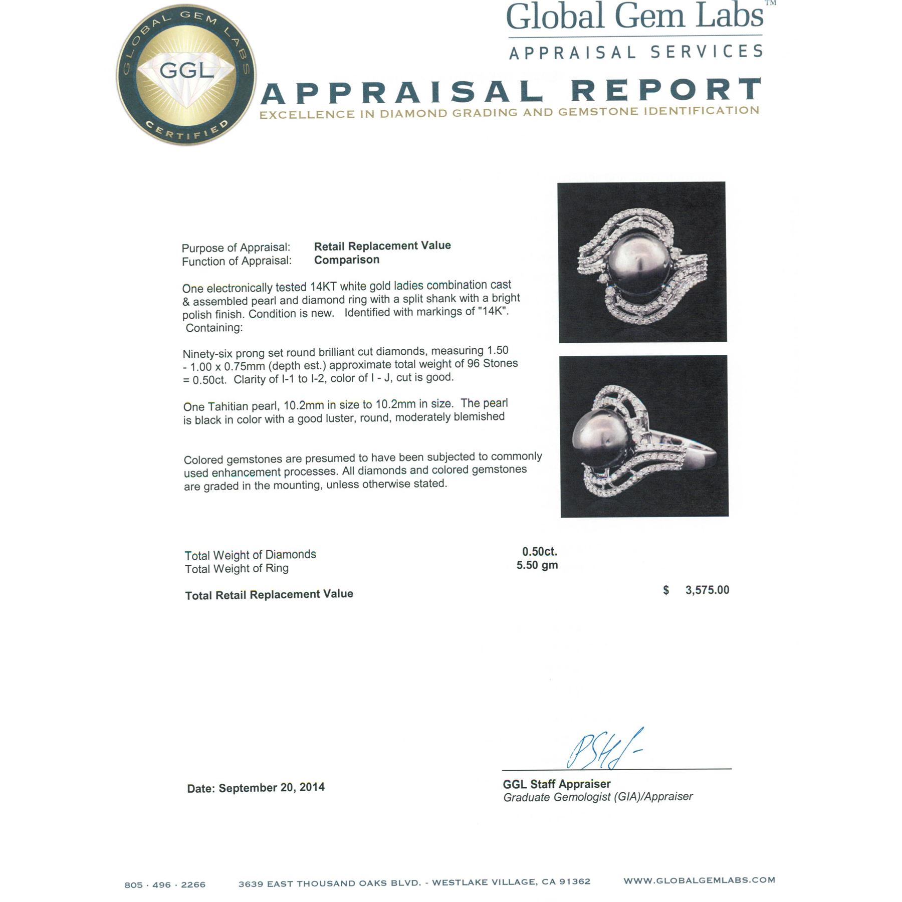 One electronically tested 14KT white gold ladies combination cast & assembled pearl and diamond ring with a split shank with a bright polish finish. Identified with markings of "14K". Condition is new. Containing: Ninety-Six prong set round brilliant cut diamonds, measuring 1.50 - 1.00 x 0.75mm (depth est.) approximate total weight of 96 Stones = 0.50 ct. Clarity: I-1 to I-2. Color: I - J, Cut is Good. One Tahitian pearl, 10.2mm in size to 10.2mm in size. The pearl is black in color with a good luster, round, moderately blemished Colored gemstones are presumed to have been subjected to commonly used enhancement processes. All diamonds and colored gemstones are graded in the mounting, unless otherwise stated. Total Weight of Diamonds 0.50 ct. Total Weight of Ring 5.50 grams. GGL Appraised.