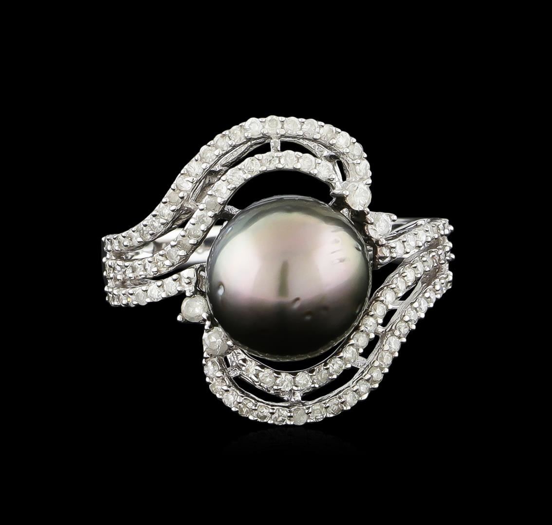 One electronically tested 14KT white gold ladies combination cast & assembled pearl and diamond ring with a split shank with a bright polish finish. Identified with markings of "14K". Condition is new. Containing: Ninety-Six prong set round brilliant cut diamonds, measuring 1.50 - 1.00 x 0.75mm (depth est.) approximate total weight of 96 Stones = 0.50 ct. Clarity: I-1 to I-2. Color: I - J, Cut is Good. One Tahitian pearl, 10.2mm in size to 10.2mm in size. The pearl is black in color with a good luster, round, moderately blemished Colored gemstones are presumed to have been subjected to commonly used enhancement processes. All diamonds and colored gemstones are graded in the mounting, unless otherwise stated. Total Weight of Diamonds 0.50 ct. Total Weight of Ring 5.50 grams. GGL Appraised.