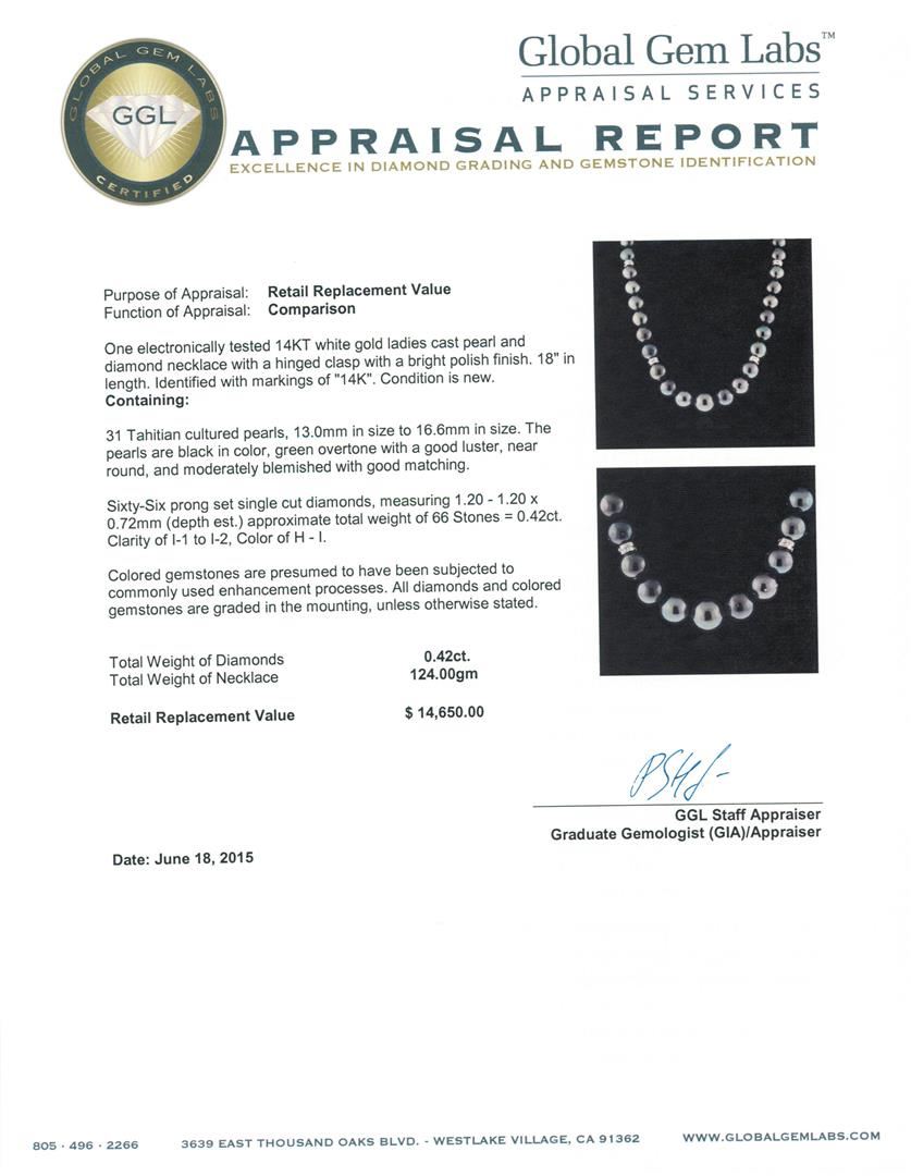 One electronically tested 14KT white gold baby cast pearl and diamond necklace with a hinged clasp with a bright polish finish. 18" in length. Identified with markings of "14K". Condition is new. Containing: 31 Tahitian pearls, 13.0mm in size to 16.6mm in size. The pearls are black in color, green overtone with a good luster, near round, and moderately blemished with good matching. Sixty-Six prong set single cut diamonds, measuring 1.20 - 1.20 x 0.72mm (depth est.) approximate total weight of 66 Stones = 0.42ct. Clarity: I-1 to I-2. Color: H - I. Colored gemstones are presumed to have been subjected to commonly used enhancement processes. All diamonds and colored gemstones are graded in the mounting, unless otherwise stated. Total Weight of Diamonds 0.42ct. Total Weight of Necklace124.00 grams. GGL Appraised at $14,650.00.