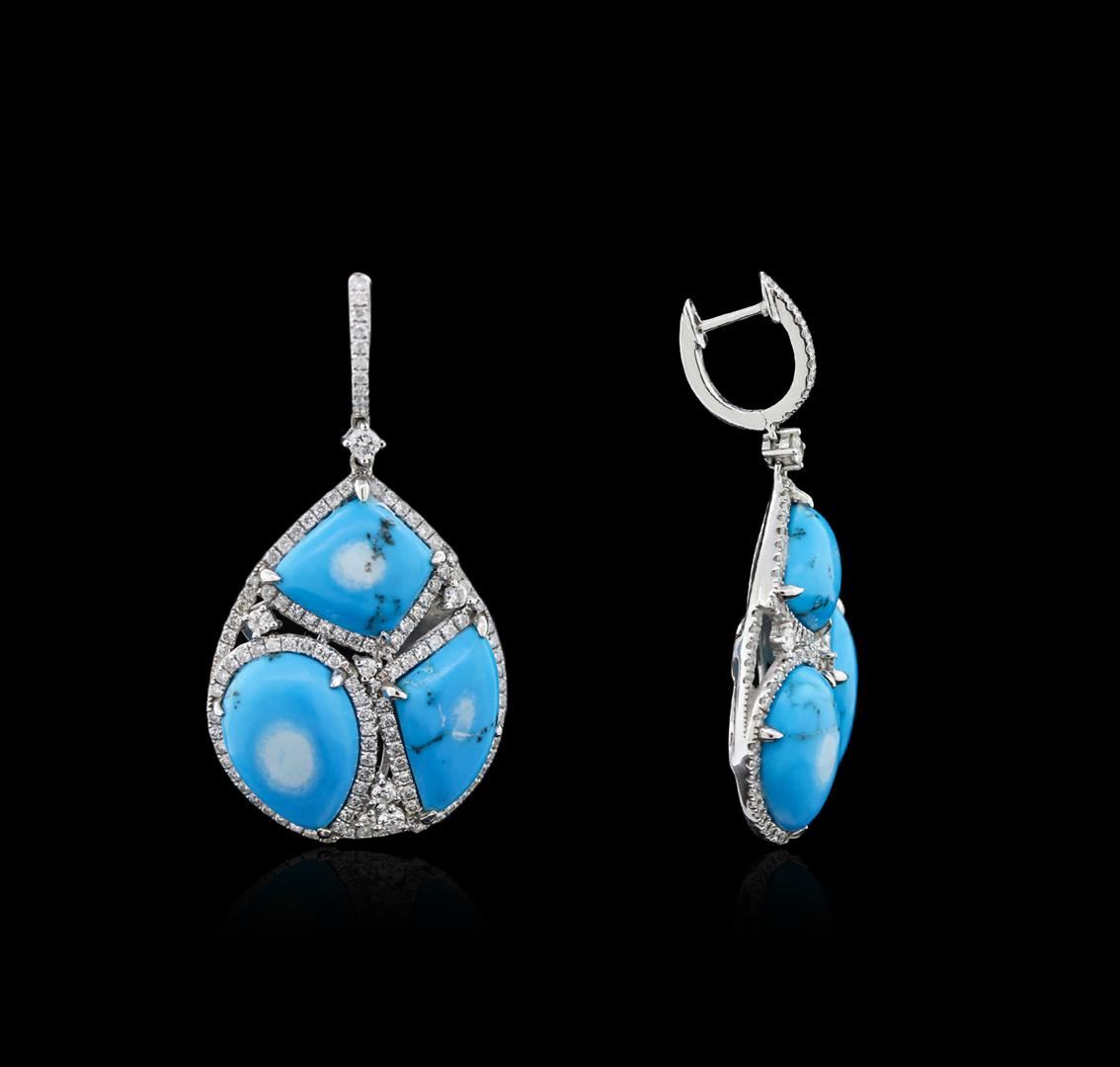 One pair of earrings featuring: 14KT white gold weighing 11.05 grams containing six turquoise and 244 round diamonds with a total weight of 2.00ct.