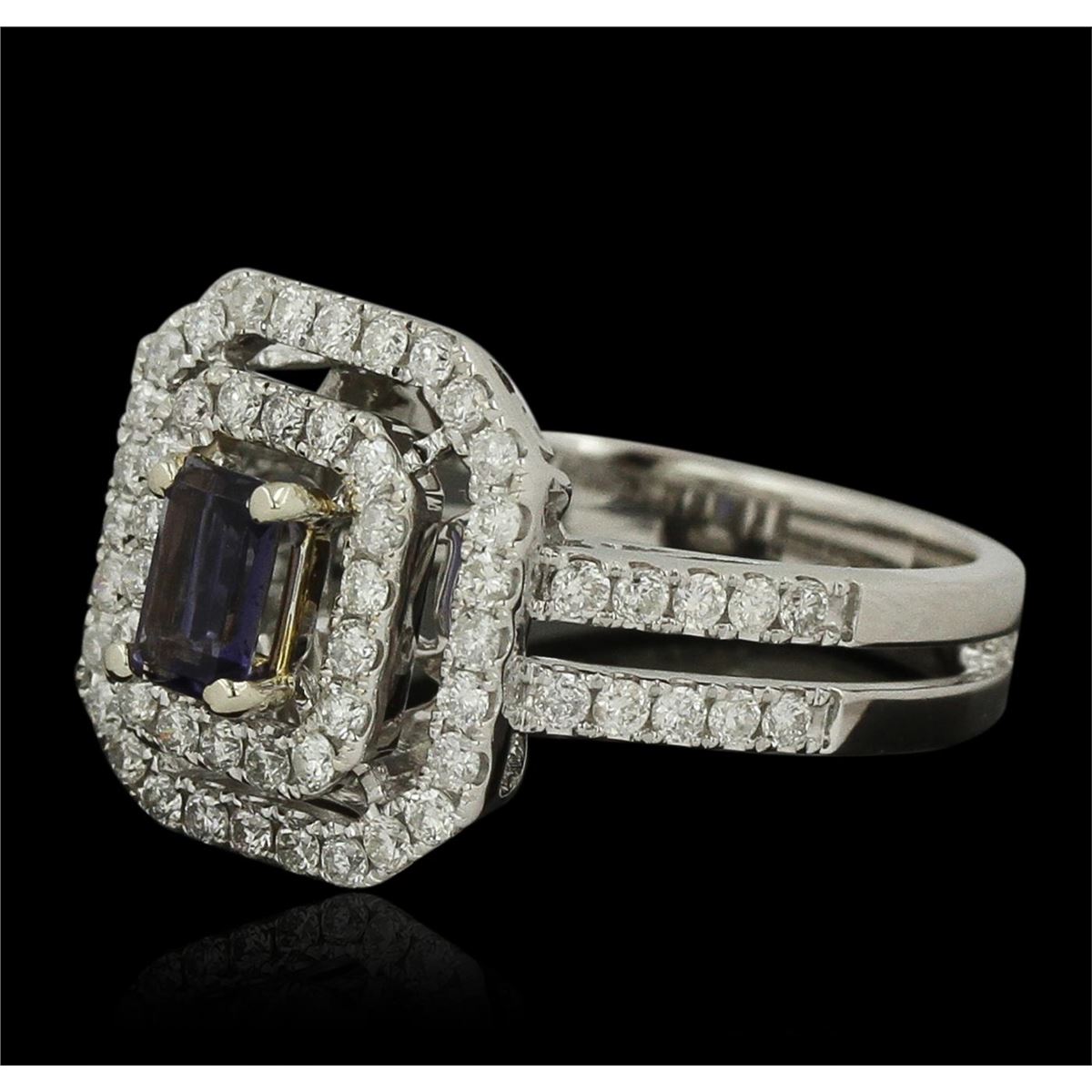 One electronically tested 14KT white and yellow gold Ladies combination cast & assembled ring with a bright polish finish. Condition is new. Identified with markings of "14K". Containing: Sixty-Five prong set round brilliant cut diamonds, measuring 1.20 - 1.20 x 0.72mm (depth est.) approximate. Total Weight of 65 Stones = 0.98ct. Clarity: I-1 to I-2. Color: J - K, Cut is Good. One prong set emerald modified step cut natural tanzanite, measuring 5.80 x 3.90 x 2.80mm, exact weight 0.40ct., clarity is eye clean, type I, medium, very slightly grayish, violet color, (GIA V 5/3), cut is very good. Colored gemstones are presumed to have been subjected to commonly used color/clarity enhancement processes. Total Weight of Colored Stones 0.40ct. Total Weight of Diamonds 0.98ct. Total Weight of Ring 6.40 grams. GGL Appraised at $4,080.00.