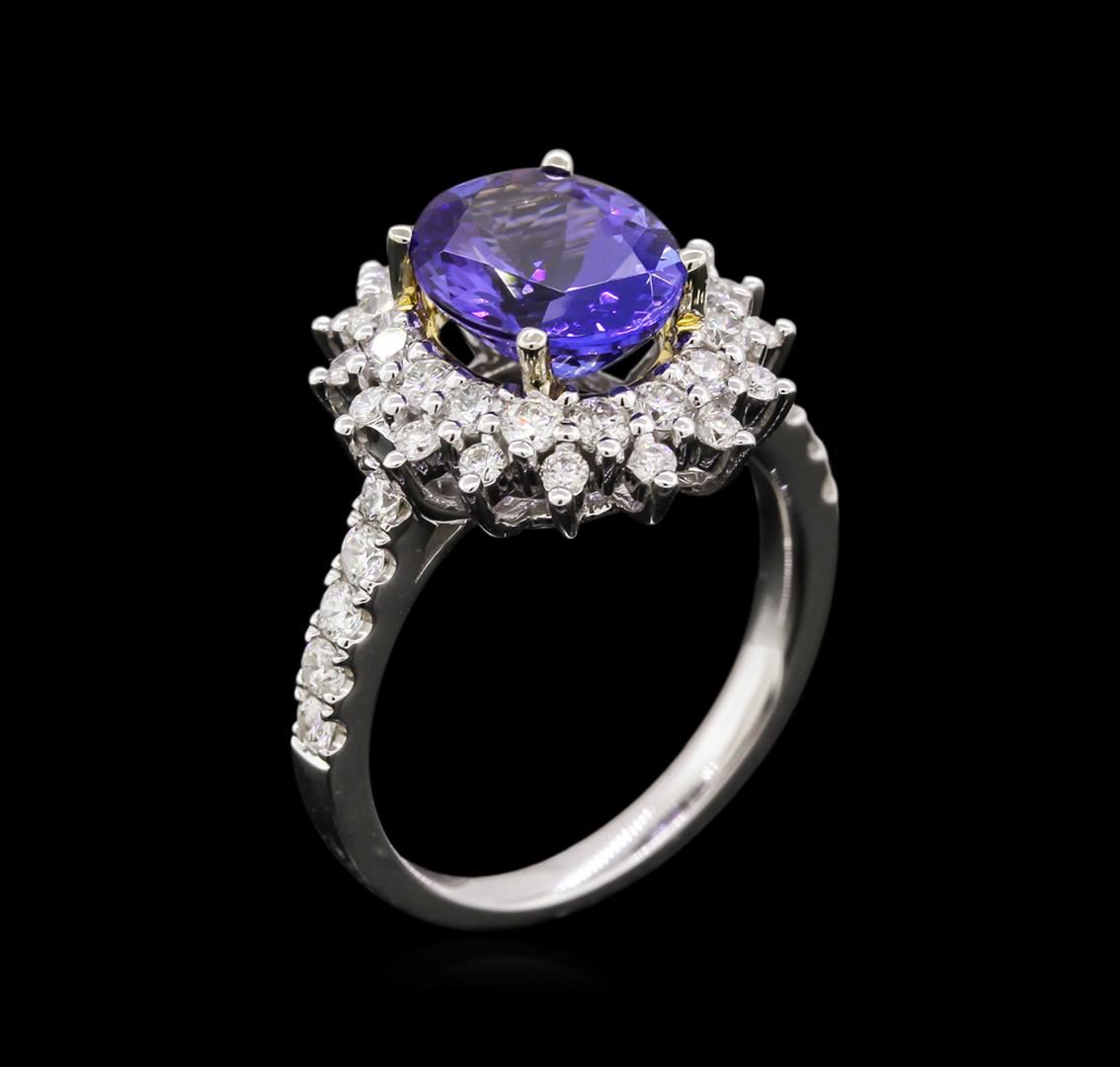 One electronically tested 14KT white and yellow gold Ladies combination cast & assembled ring with a bright polish finish. Condition is new. Identified with markings of "14K". Containing: One prong set oval modified brilliant cut natural tanzanite, measuring 10.10 x 7.50 x 4.88mm, exact weight 2.83ct., clarity is eye clean, type I, medium, very slightly grayish, bluish violet color, (GIA bV 5/3), cut is very good. Colored gemstones are presumed to have been subjected to commonly used color/clarity enhancement processes. Twenty-Six prong set round brilliant cut diamonds, measuring 2.00 - 2.00 x 1.20mm (depth est.) approximate. Total Weight of 26 Stones = 0.89ct. Clarity: SI-1 to I-1. Color: H - I, Cut is Good. Sixteen prong set round brilliant cut diamonds, measuring 1.50 - 1.50 x 0.90mm (depth est.) approximate. Total Weight of 16 Stones = 0.24ct. Clarity: I-1 to I-2. Color: I - J, Cut is Good. Total Weight of Colored Stones 2.83ct. Total Weight of Diamonds 1.13ct. Total Weight of Ring 6.10 grams. GGL Appraised at $8,585.00.