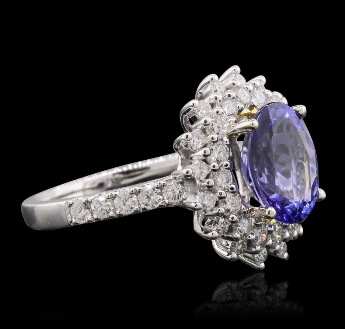 One electronically tested 14KT white and yellow gold Ladies combination cast & assembled ring with a bright polish finish. Condition is new. Identified with markings of "14K". Containing: One prong set oval modified brilliant cut natural tanzanite, measuring 10.10 x 7.50 x 4.88mm, exact weight 2.83ct., clarity is eye clean, type I, medium, very slightly grayish, bluish violet color, (GIA bV 5/3), cut is very good. Colored gemstones are presumed to have been subjected to commonly used color/clarity enhancement processes. Twenty-Six prong set round brilliant cut diamonds, measuring 2.00 - 2.00 x 1.20mm (depth est.) approximate. Total Weight of 26 Stones = 0.89ct. Clarity: SI-1 to I-1. Color: H - I, Cut is Good. Sixteen prong set round brilliant cut diamonds, measuring 1.50 - 1.50 x 0.90mm (depth est.) approximate. Total Weight of 16 Stones = 0.24ct. Clarity: I-1 to I-2. Color: I - J, Cut is Good. Total Weight of Colored Stones 2.83ct. Total Weight of Diamonds 1.13ct. Total Weight of Ring 6.10 grams. GGL Appraised at $8,585.00.