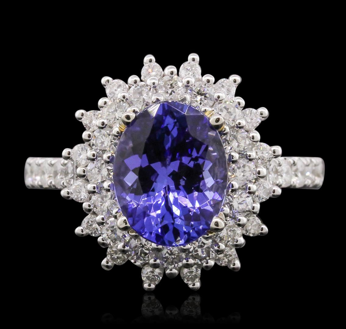 One electronically tested 14KT white and yellow gold Ladies combination cast & assembled ring with a bright polish finish. Condition is new. Identified with markings of "14K". Containing: One prong set oval modified brilliant cut natural tanzanite, measuring 10.10 x 7.50 x 4.88mm, exact weight 2.83ct., clarity is eye clean, type I, medium, very slightly grayish, bluish violet color, (GIA bV 5/3), cut is very good. Colored gemstones are presumed to have been subjected to commonly used color/clarity enhancement processes. Twenty-Six prong set round brilliant cut diamonds, measuring 2.00 - 2.00 x 1.20mm (depth est.) approximate. Total Weight of 26 Stones = 0.89ct. Clarity: SI-1 to I-1. Color: H - I, Cut is Good. Sixteen prong set round brilliant cut diamonds, measuring 1.50 - 1.50 x 0.90mm (depth est.) approximate. Total Weight of 16 Stones = 0.24ct. Clarity: I-1 to I-2. Color: I - J, Cut is Good. Total Weight of Colored Stones 2.83ct. Total Weight of Diamonds 1.13ct. Total Weight of Ring 6.10 grams. GGL Appraised at $8,585.00.