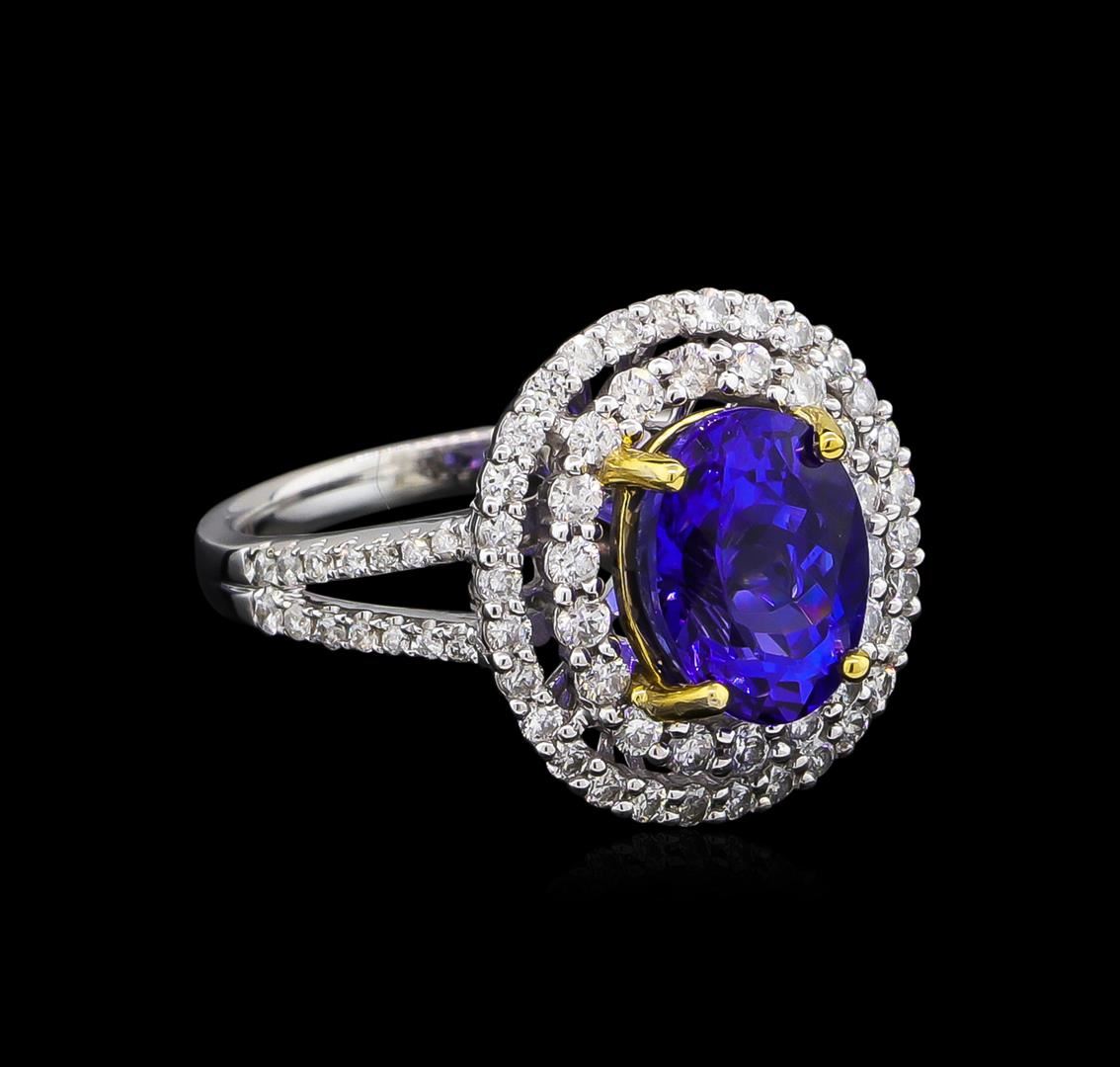 One electronically tested 14KT white and yellow gold Ladies combination cast & assembled ring with a bright polish finish. Condition is new. Identified with markings of "14K". Containing: One prong set oval modified brilliant cut natural tanzanite, measuring 9.80 x 7.60 x 4.94mm, exact weight 3.20ct., clarity is eye clean, type I, medium, moderately strong, bluish violet color, (GIA bV 5/4), cut is very good. Colored gemstones are presumed to have been subjected to commonly used color/clarity enhancement processes. Fifty-Eight prong set round brilliant cut diamonds, measuring 1.10 - 1.10 x 0.66mm (depth est.) approximate. Total Weight of 58 Stones = 0.49ct. Clarity: I-1 to I-2. Color: I - J, Cut is Good. Eighteen prong set round brilliant cut diamonds, measuring 1.50 - 1.50 x 0.90mm (depth est.) approximate. Total Weight of 18 Stones = 0.50ct. Clarity: I-1 to I-2. Color: I - J, Cut is Good.. Total Weight of Colored Stones 3.20ct. Total Weight of Diamonds 0.99ct. Total Weight of Ring 5.60 grams. GGL Appraised at $7,400.00.