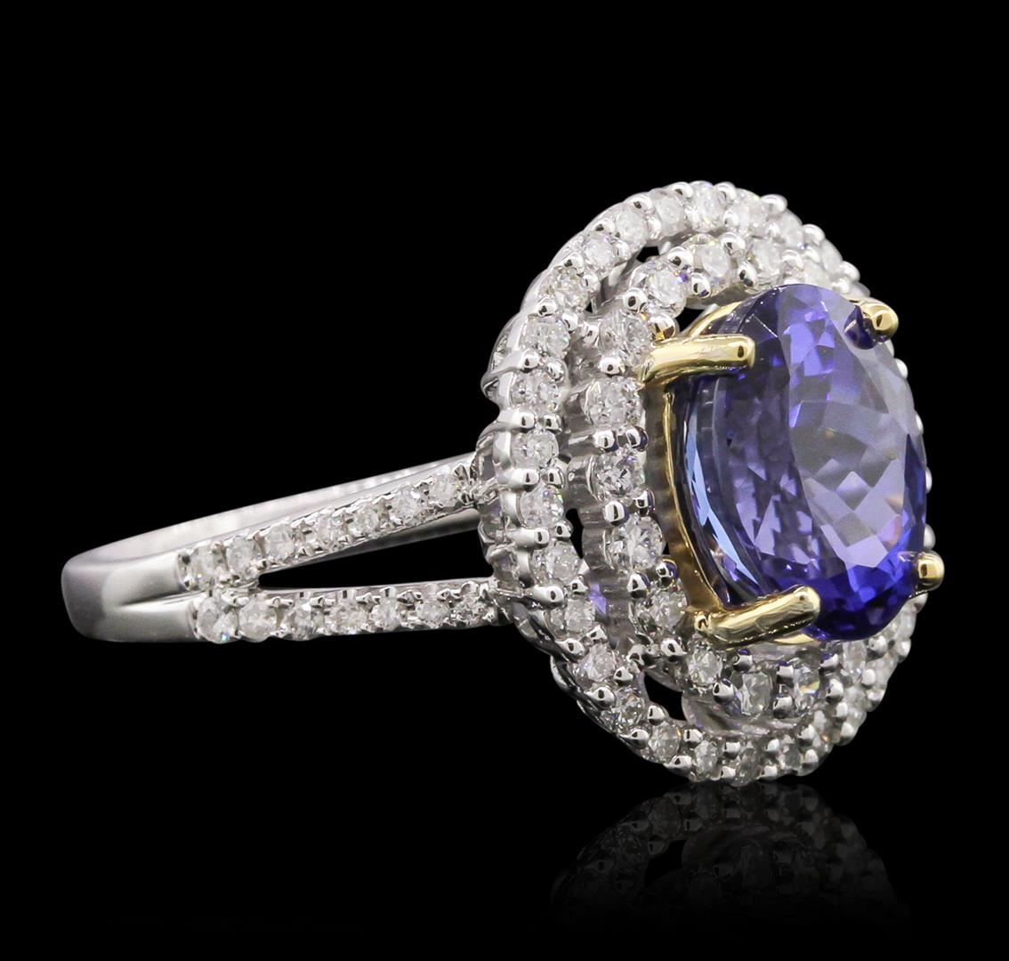 One electronically tested 14KT white and yellow gold Ladies combination cast & assembled ring with a bright polish finish. Condition is new. Identified with markings of "14K". Containing: One prong set oval modified brilliant cut natural tanzanite, measuring 9.80 x 7.60 x 4.94mm, exact weight 3.20ct., clarity is eye clean, type I, medium, moderately strong, bluish violet color, (GIA bV 5/4), cut is very good. Colored gemstones are presumed to have been subjected to commonly used color/clarity enhancement processes. Fifty-Eight prong set round brilliant cut diamonds, measuring 1.10 - 1.10 x 0.66mm (depth est.) approximate. Total Weight of 58 Stones = 0.49ct. Clarity: I-1 to I-2. Color: I - J, Cut is Good. Eighteen prong set round brilliant cut diamonds, measuring 1.50 - 1.50 x 0.90mm (depth est.) approximate. Total Weight of 18 Stones = 0.50ct. Clarity: I-1 to I-2. Color: I - J, Cut is Good.. Total Weight of Colored Stones 3.20ct. Total Weight of Diamonds 0.99ct. Total Weight of Ring 5.60 grams. GGL Appraised at $7,400.00.