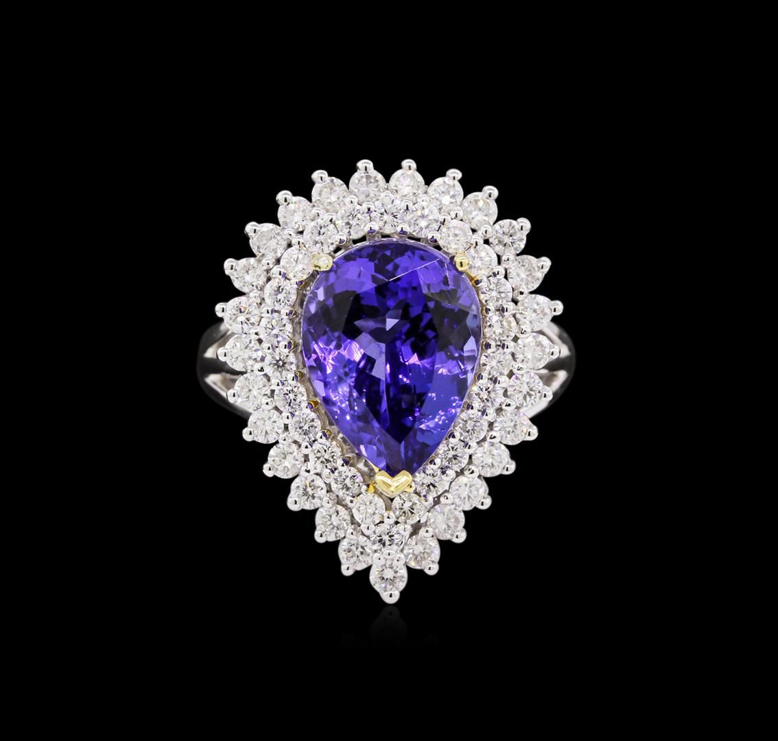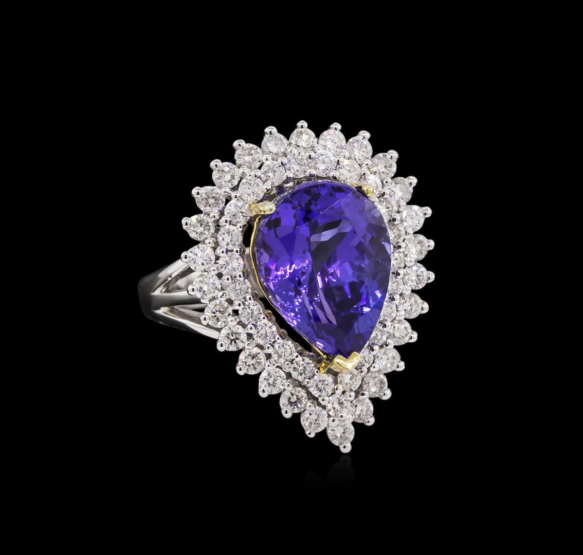 One electronically tested 14KT white and yellow gold Ladies combination cast & assembled fashion ring with a bright polish finish. Condition is new. Identified with markings of "14K". Containing: Twenty-Four prong set round brilliant cut diamonds, measuring 1.80 - 1.80 x 1.08mm (depth est.) approximate. Total Weight of 24 Stones = 0.65ct. Clarity: SI-2 to I-1. Color: H - I, Cut is Good. Twenty-Seven prong set round brilliant cut diamonds, measuring 2.00 - 2.00 x 1.50mm (depth est.) approximate. Total Weight of 27 Stones = 1.26ct. Clarity: SI-2. Color: H - I, Cut is Good. One prong set pear modified brilliant cut natural tanzanite, measuring 14.00 x 10.00 x 6.50mm, approximate weight of 6.89ct., clarity is eye clean, type I, medium, moderately strong, bluish violet color, (GIA bV 5/4), cut is very good. Colored gemstones are presumed to have been subjected to commonly used color/clarity enhancement processes. Total Weight of Colored Stones 6.89ct. Total Weight of Diamonds 1.91ct. Total Weight of Ring 9.90 grams. GGL Appraised at $17,260.00.