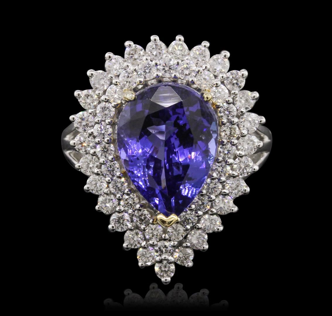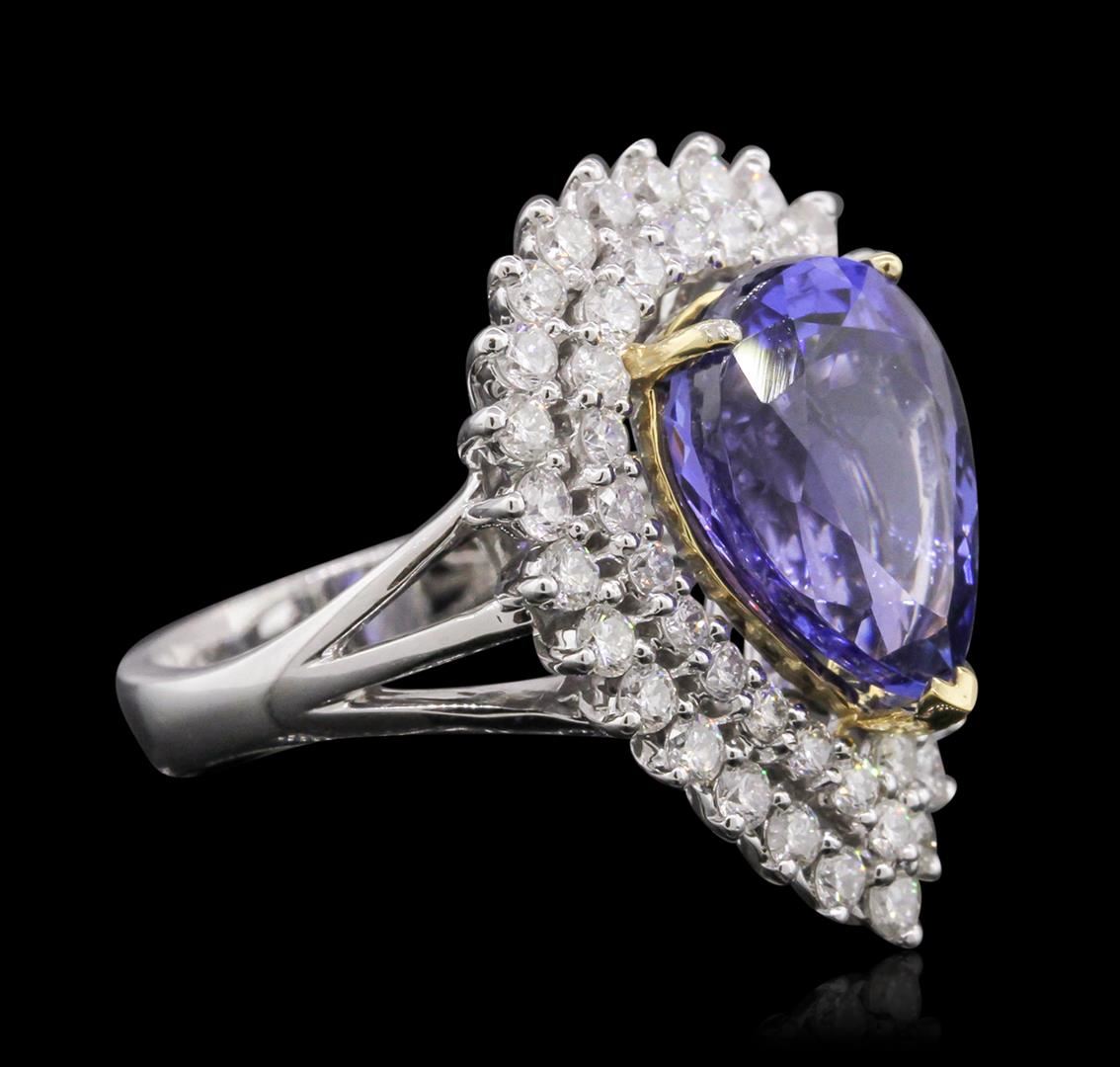 One electronically tested 14KT white and yellow gold Ladies combination cast & assembled fashion ring with a bright polish finish. Condition is new. Identified with markings of "14K". Containing: Twenty-Four prong set round brilliant cut diamonds, measuring 1.80 - 1.80 x 1.08mm (depth est.) approximate. Total Weight of 24 Stones = 0.65ct. Clarity: SI-2 to I-1. Color: H - I, Cut is Good. Twenty-Seven prong set round brilliant cut diamonds, measuring 2.00 - 2.00 x 1.50mm (depth est.) approximate. Total Weight of 27 Stones = 1.26ct. Clarity: SI-2. Color: H - I, Cut is Good. One prong set pear modified brilliant cut natural tanzanite, measuring 14.00 x 10.00 x 6.50mm, approximate weight of 6.89ct., clarity is eye clean, type I, medium, moderately strong, bluish violet color, (GIA bV 5/4), cut is very good. Colored gemstones are presumed to have been subjected to commonly used color/clarity enhancement processes. Total Weight of Colored Stones 6.89ct. Total Weight of Diamonds 1.91ct. Total Weight of Ring 9.90 grams. GGL Appraised at $17,260.00.