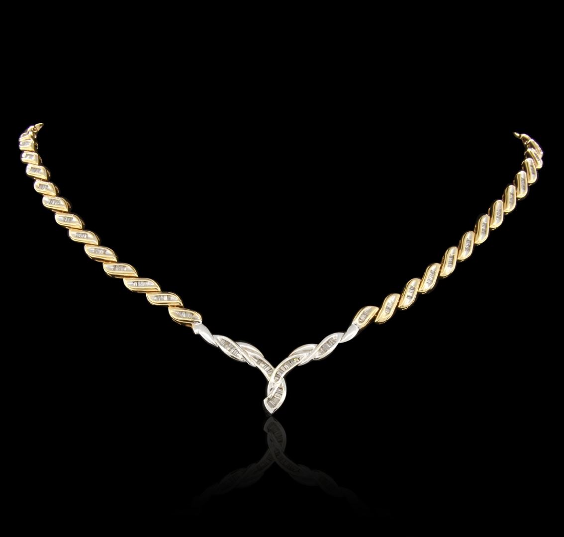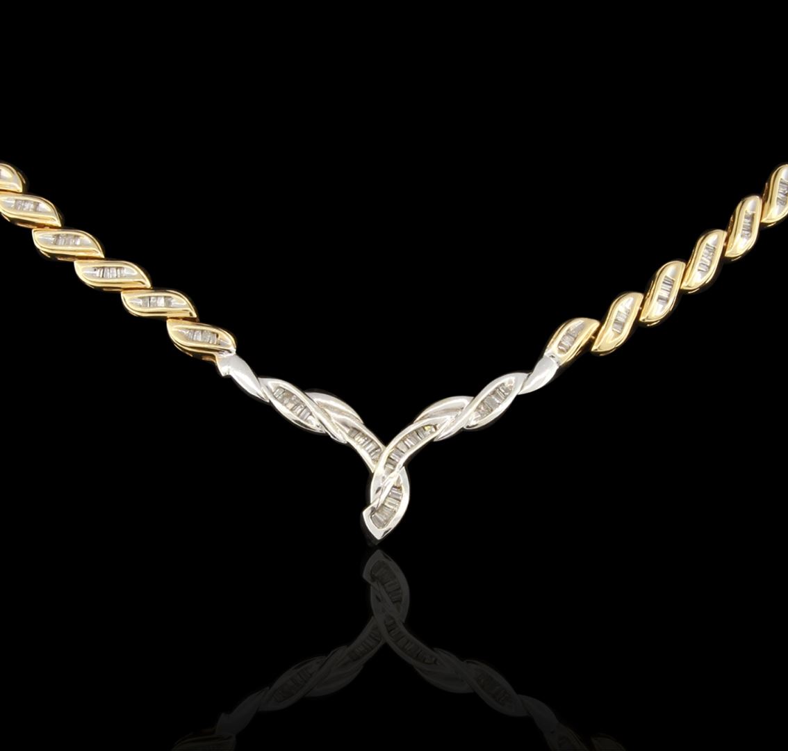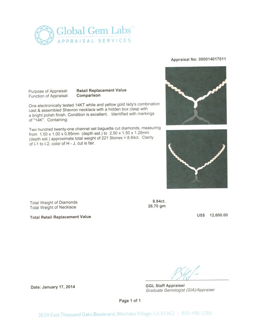 One electronically tested 14KT white and yellow gold Ladies combination cast & assembled Shevron necklace with a hidden box clasp with a bright polish finish. Identified with markings of "14K". Condition is excellent. Containing: Two Hundred Twenty-One channel set baguette cut diamonds, measuring from 1.50 x 1.00 x 0.85mm (depth est.) to 2.50 x 1.50 x 1.28mm (depth est.) approximate total weight of 221 Stones = 8.84ct. Clarity of I-1 to I-2, Color of H - J, Cut is Fair. Total Weight of Diamonds 8.84ct. Total Weight of Necklace 26.70gm. GGL Appraised at $12,600.00.
