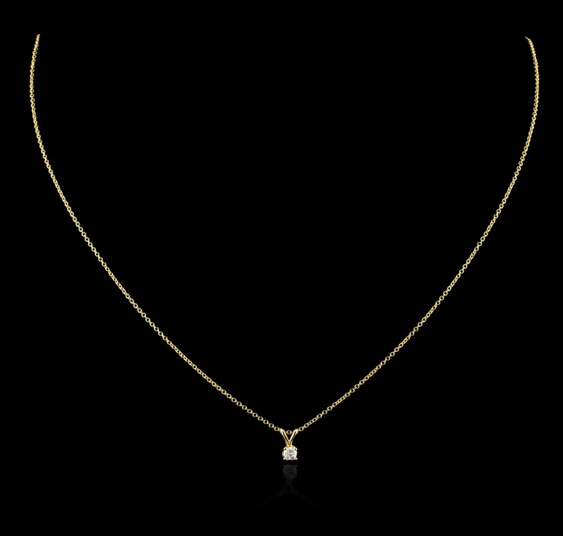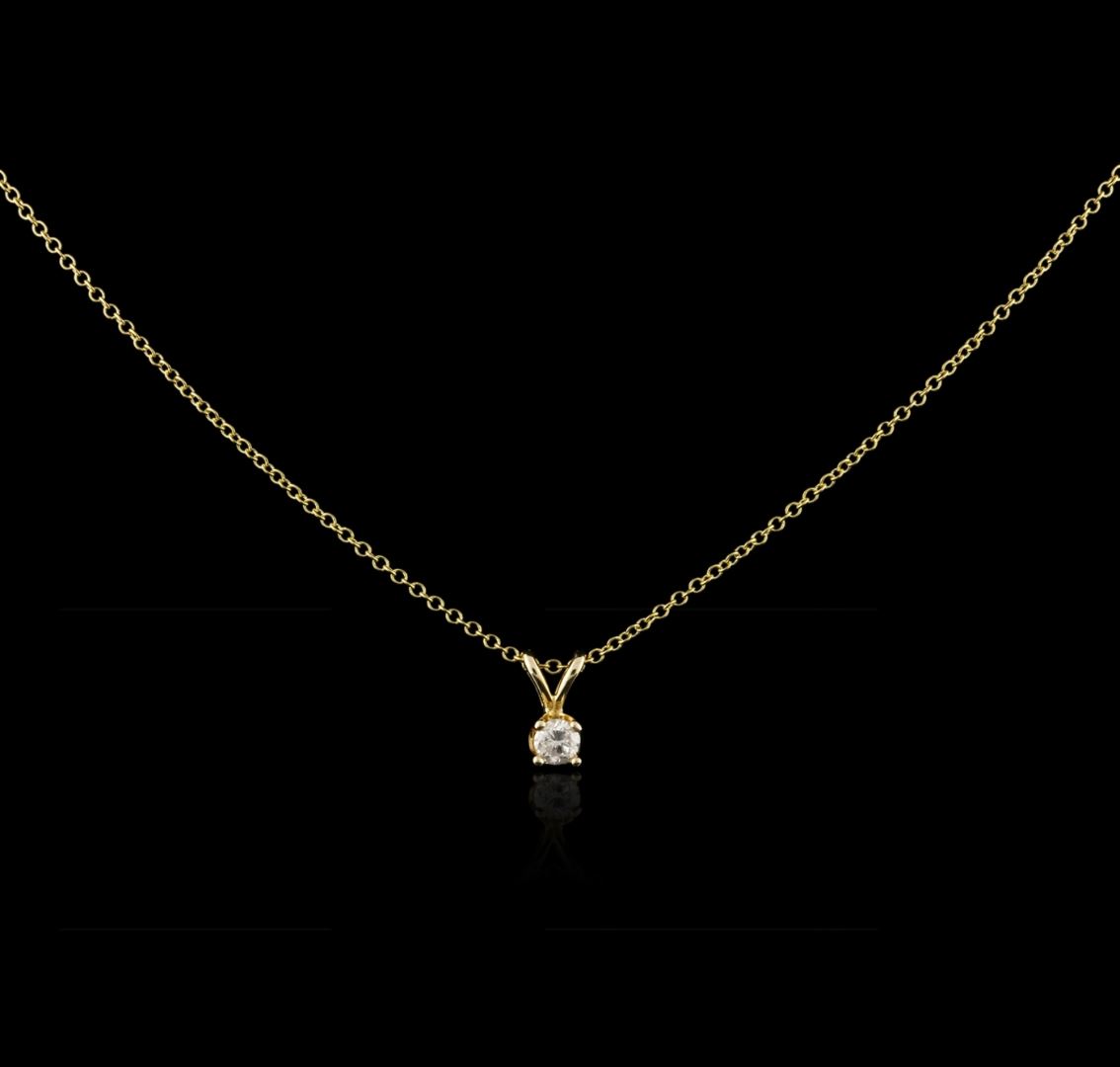 One solitaire pendant with chain featuring: 14KT yellow gold weighing 1.48 grams containing one prong set round diamond with a total weight of 0.11ct.