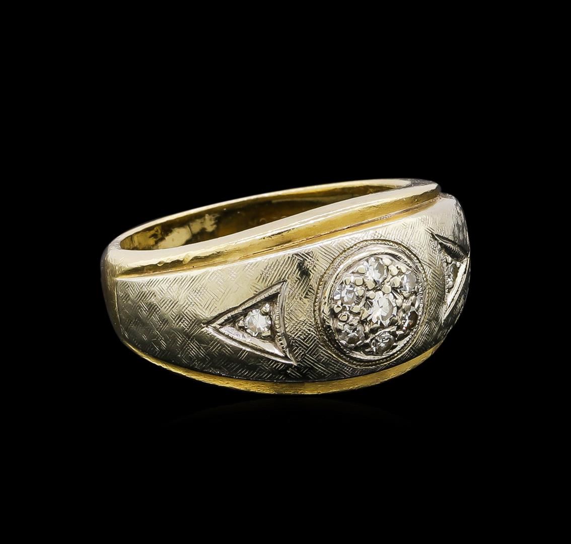 One electronically tested 14KT yellow gold cast diamond ring. The ring features an organized diamond cluster accented by a single diamond on either side, completed by a three and one-half millimeter wide band. Bright and patterned finish with milgrain detailing and rhodium accents. Identified with markings of "14K". Condition is good. Containing: One prong set single cut diamond, measuring 2.10 - 2.00 x 1.23mm (depth est.) approximate weight of 0.03ct. Graded in the setting. Clarity: SI-1. Color: I Eight prong set single cut diamonds, measuring 1.70 - 1.60 x 0.99mm (depth est.) approximate total weight of 8 Stones = 0.15ct. Graded in the setting. Clarity: SI-1 to SI-2. Color: H - J. Total Weight of Diamonds 0.18ct. Total Weight of Ring 8.07 grams. AIG Appraised.