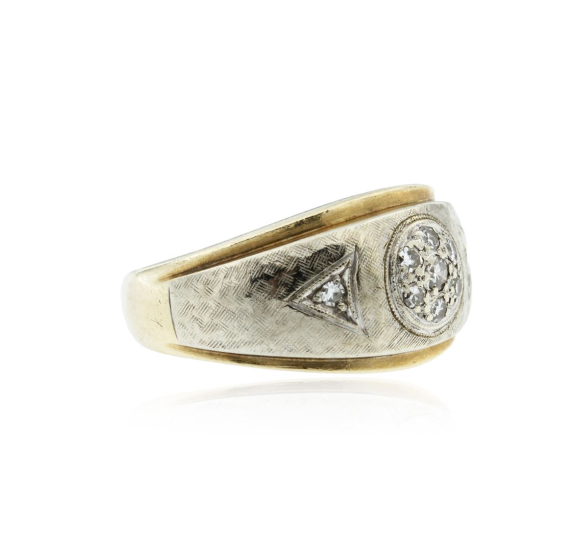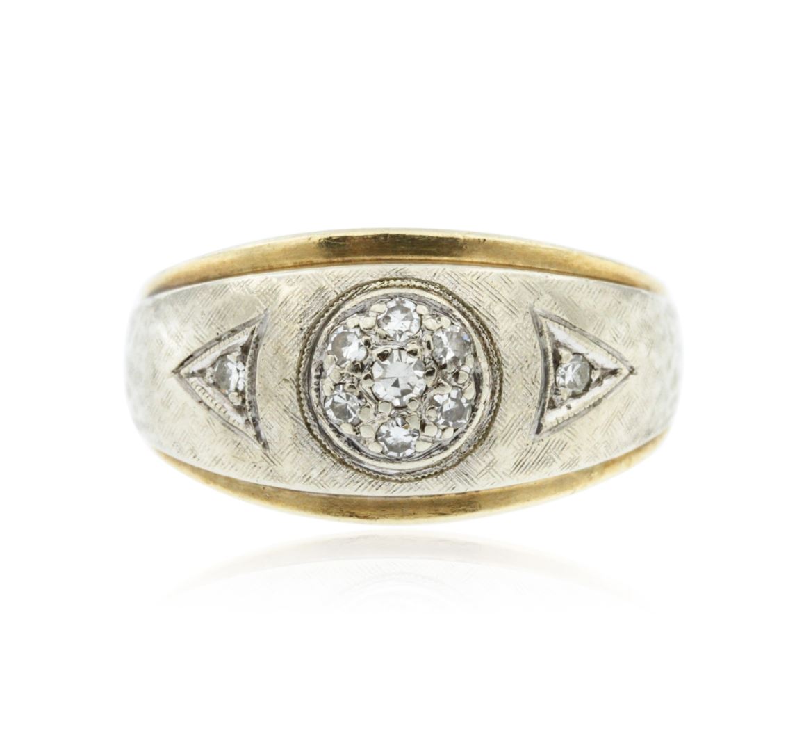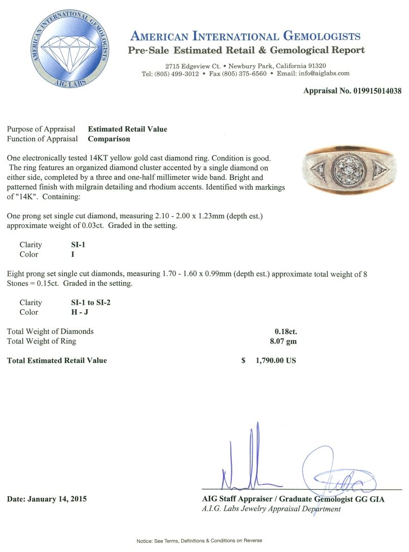 One electronically tested 14KT yellow gold cast diamond ring. The ring features an organized diamond cluster accented by a single diamond on either side, completed by a three and one-half millimeter wide band. Bright and patterned finish with milgrain detailing and rhodium accents. Identified with markings of "14K". Condition is good. Containing: One prong set single cut diamond, measuring 2.10 - 2.00 x 1.23mm (depth est.) approximate weight of 0.03ct. Graded in the setting. Clarity: SI-1. Color: I Eight prong set single cut diamonds, measuring 1.70 - 1.60 x 0.99mm (depth est.) approximate total weight of 8 Stones = 0.15ct. Graded in the setting. Clarity: SI-1 to SI-2. Color: H - J. Total Weight of Diamonds 0.18ct. Total Weight of Ring 8.07 grams. AIG Appraised.
