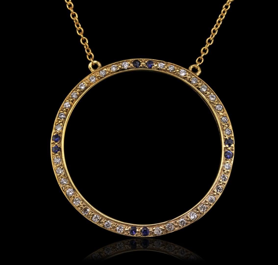 One pendant with chain featuring: 14KT yellow gold with a total weight of 7.50 grams, sapphire with a total weight of 0.20ctw, and diamonds with a total weight of 0.80ctw.