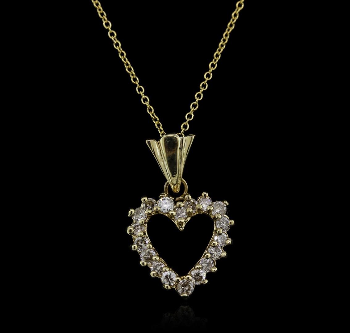 One heart pendant with chain featuring: 14KT yellow gold weighing 2.79 grams containing diamonds with a total weight of 0.25ct.